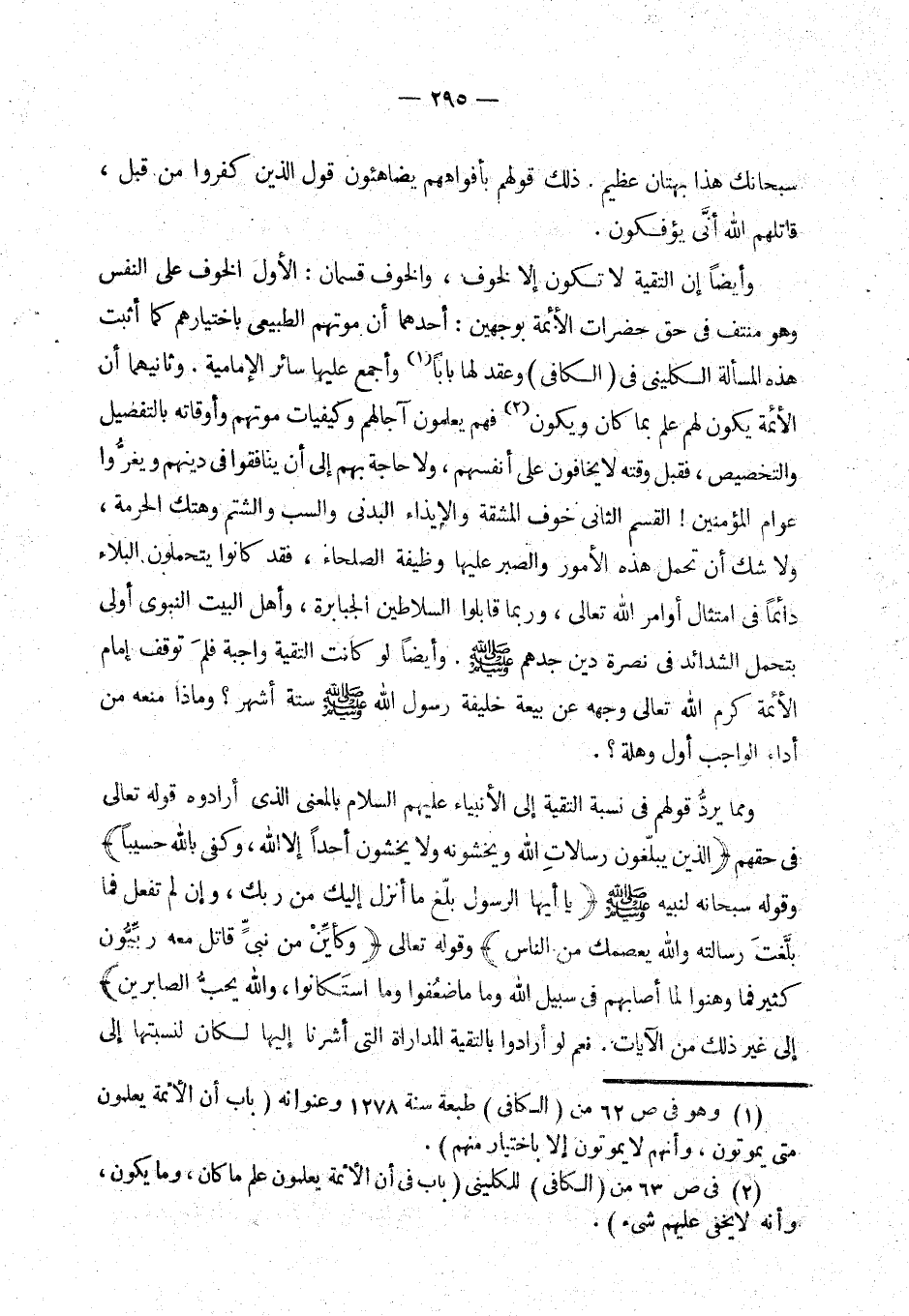 الأول الخوف على النفس وهو منتف في حضرات الأئمة بوجهين: أحدهما أن موتهم الطبيعي باختيارهم كما أثبت هذه المسألة الكليني في (الكافي) وعقد لها بابا وأجمع عليها سائر الإمامية. (¬1) وثانيهما أن الأئمة يكون لهم علم بما كان ويكون، (¬2) فهم يعلمون آجالهم وكيفيات موتهم وأوقاته بالتفصيل والتخصيص، فقبل وقته لا يخافون على أنفسهم، ولا حاجة بهو إلى أن ينافقوا في دينهم ويغروا عوام المؤمنين.