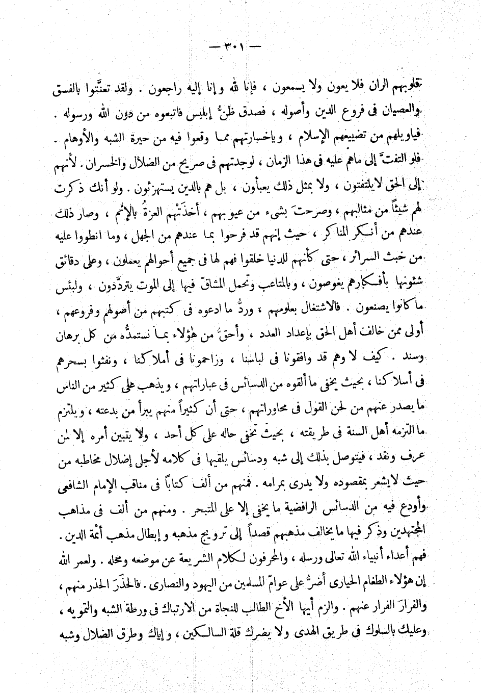 فمنهم من ألف كتابا في مناقب الإمام الشافعي وأودع فيه من الدسائس الرافضية ما يخفى إلا على المتبحر. ومنهم من ألف في مذاهب المجتهدين وذكر فيا ما يخالف مذهبهم قصدا إلى ترويج مذهبه وإبطال مذهب أئمة الدين. فهم أعداء أنبياء الله تعالى ورسله، والمحرفون لكلام الشريعة عن موضعه ومحله. ولعمر الله إن هؤلاء الطغام الحيارى أضر على عوام المسلمين من اليهود والنصارى. فالحذر الحذر منهم، والفرار الفرار منهم.