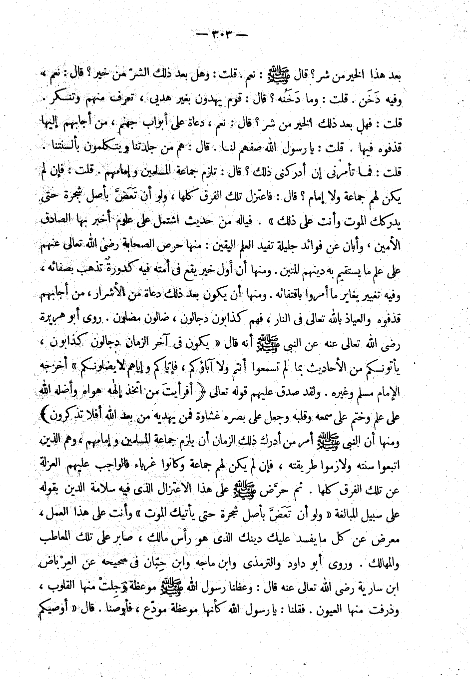 ومنها أن النبي - صلى الله عليه وسلم - أمر من أدرك الزمان أن يلزم جماعة المسلمين وإمامهم، وهم الذين اتبعوا سنته ولازموا طريقته، فإن لم يكن لهم جماعة وكانوا غرباء فالواجب عليهم العزلة عن تلك الفرق كلها. ثم حرض - صلى الله عليه وسلم - على هذا الاعتزال الذي فيه سلامة الدين بقوله على سبيل المبالغة «ولو أن تعض بأصل شجرة حتى يأتيك الموت» وأنت على هذا العمل، معرض عن كل ما يفسد عليك دينك الذي هو رأس مالك، صابر على تلك المعاطب والمهالك.