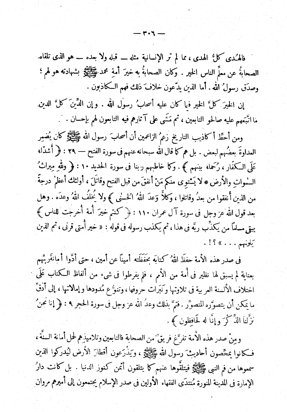ومن أحط أكاذيب التاريخ زعم الزاعمين أن أصحاب رسول الله - صلى الله عليه وسلم - كان يضمر العداوة بعضهم لبعض. بل هم كما قال الله سبحانه في سورة الفتح - 29: {أشداء على الكفار رحماء بينهم}. وكما خاطبهم ربنا في سورة الحديد 10: {ولله ميراث السماوات والأرض * لا يستوى منكم من انفق من قبل الفتح وقاتل، أولئك أعظم درجة من الذين انفقوا من بعد وقاتلوا، وكلا وعد الله الحسنى} ولا يخلف الله وعده. وهل بعد قول الله عز وجل في سورة آل عمران 110: {كنتم خير أمة أخرجت للناس} يبقى مسلما من يكذب ربه في هذا، ثم يكذب رسوله في قوله: «خير أمتي قرني، ثم الذين يلونهم ... »؟!. في صدر هذه الأمة حفظ الله كتابه بحفظته أمينا عن امين، حتى أدوا أمانة ربهم بعناية لم يسبق لها نظير في أمة من الأمم، فلم يفرطوا في شيء من ألفاظ الكتاب على اختلاف الألسنة العربية في تلاوتها ونبرات حروفها، تنوع مدودها وإمالاتها، إلى أدق ما يمكن أن يتصوره المتصور. فتم بذلك وعد الله عز وجل في سورة الحجر 9: {إنا نحن نزلنا الذكر وإنا له لحافظون}.