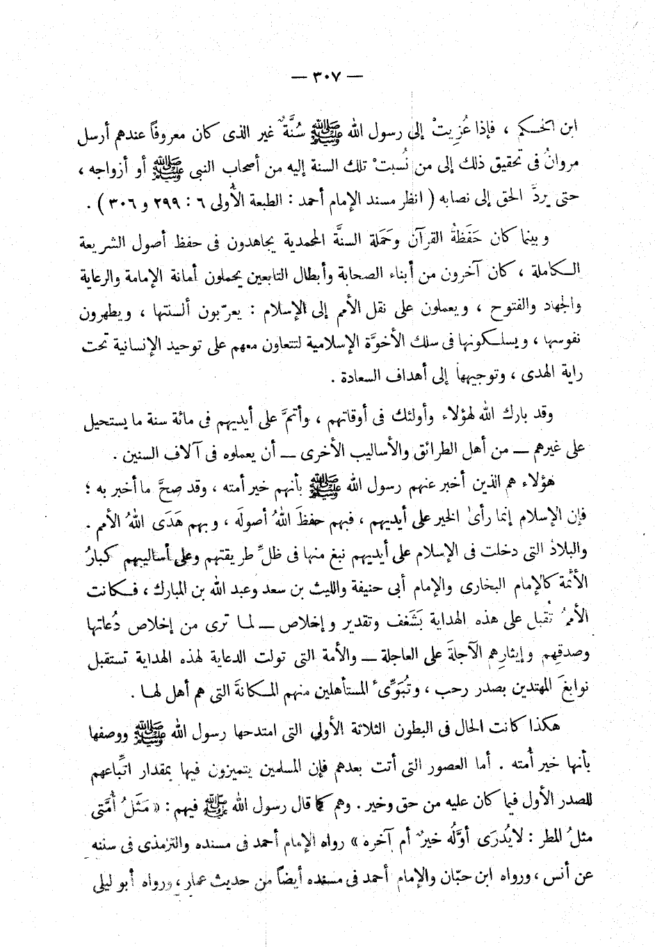 هكذا كانت الحال في البطون الثلاثة الأولى التي امتدحها رسول الله - صلى الله عليه وسلم - ووصفها بأنها خير أمته. أما العصور التي أتت بعدهم فإن المسلمين يتميزون فيها بمقدار اتباعهم للصدر الأول فيما كان عليه من حق وخير. وهم كما قال رسول الله - صلى الله عليه وسلم - فيهم: «مثل أمتي مثل المطر: لا يدرى أوله خير أم آخره» رواه الإمام أحمد في مسنده والترمذي في سننه عن أنس، ورواه ابن حبان والإمام أحمد في مسنده أيضا من حديث عمار، ورواه أبو ليلى
