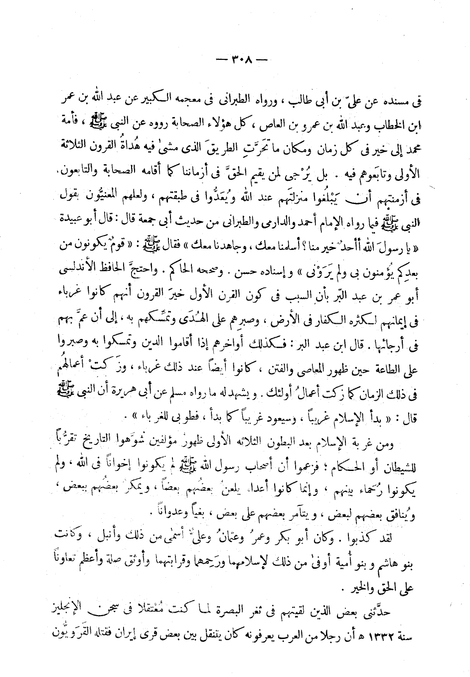 في مسنده عن علي بن أبي طالب، ورواه الطبراني في معجمه الكبير عن عبد الله بن عمر بن الخطاب وعبد الله بن عمرو بن العاص، كل هؤلاء الصحابة رووه عن النبي - صلى الله عليه وسلم -. فأمة محمد إلى خير في كل زمان ومكان ما تحرت الطريق الذي مشى فيه هداة القرون الثلاثة الأولى وتابعوهم فيه. بل يرجى لمن يقيم الحق في أزماننا كما أقامه الصحابة والتابعون في أزمنتهم أن يبلغوا منزلتهم عند الله ويعدوا في طبقتهم، ولعلهم المعنيون بقول النبي - صلى الله عليه وسلم - فيما رواه الإمام أحمد والدارمي والطبراني من حديث أبي جمعة قال: قال أبو عبيدة «يا رسول الله أأحد خير منا؟ أسلمنا معك، وجاهدنا معك» فقال - صلى الله عليه وسلم -: «قوم يكونون من بعدكم يؤمنون بي ولم يروني» وإسناده حسن، وصححه الحاكم. واحتج الحافظ الأندلسي أبو عمر بن عبد البر بأن السبب في كون القرن الأول خير القرون أنهم كانوا غرباء في إيمانهم لكثرة الكفار في الأرض وصبرهم على الهدى وتمسكهم به، إلى أن عم بهم في أرجائها. قال ابن عبد البر: فكذلك أواخرهم إذا أقاموا الدين وتمسكوا به وصبروا على الطاعة حين ظهور المعاصي والفتن، كانوا أيضا عند ذلك غرباء، وزكت أعمالهم في ذلك الزمان كما زكت أعمال أولئك. ويشهد له ما رواه مسلم عن أبي هريرة أن النبي - صلى الله عليه وسلم - قال: «بدأ الإسلام غريبا، وسيعود غريبا كما بدأ، فطوبى للغرباء».
