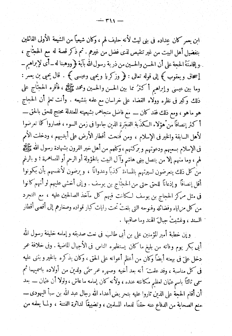 ابن يعمر كان عداده في بني ليث لأنه حليف لهم، وكان شيعيا من الشيعة الأولى القائلين بتفضيل أهل البيت من غير تنقيص لذي فضل من غيرهم. ثم ذكر قصة له في الحجاج وإقامته الحجة على أن الحسن والحسين من ذرية رسول الله بآية {ووهبنا له - أي لإبراهيم - إسحاق ويعقوب} إلى قوله: {وزكريا ويحيى وعيسى}. قال يحيى بن يعمر: وما بين عيسى وإبراهيم أكثر مما بين الحسن والحسين ومحمد - صلى الله عليه وسلم -، فأقره الحجاج على ذلك وكبر في نظره وولاه القضاء على خراسان مع علمه بتشيعه. وأنت تعلم أن الحجاج هو ما هو، ومع ذلك فقد كان - مع فاضل متجاهر بشيعيته المعتدلة محتج للحق بالحق - أكثر إنصافا من هؤلاء الكذبة الفجرة الذين جاءوا في زمن السوء فصاروا كلما تعرضوا لأهل السابقة والخير في الإسلام، ومن فتحت اقطار الأرض على أيديهم، ودخلت الأمم في الإسلام بسعيهم ودعوتهم وبركتهم وكلهم من أهل خير القرون بشهادة رسول الله - صلى الله عليه وسلم - لهم، وما منهم إلا من يتصل ببني هاشم وال البيت بالخؤولة أو الرحم أو المصاهرة، وبالرغم من كل ذلك يتعرضون لسيرتهم بالمساءة كذبا وعدوانا، ويرضون لأنفسهم بأن يكونوا أقل إنصافا وإذعانا للحق حتى من الحجاج بن يوسف. وإني أخشى عليهم لو أنهم كانوا في مثل مركز الحجاج بن يوسف لكانت فيهم كل مآخذ الصالحين عليه، مع التجرد من كل مزاياه وفضائله وفتوحه التي بلغت تحت رايات كبار قواده وضغائر إلى أقصى أقطار السند، وغشيت جبال الهند وما صاقبها.