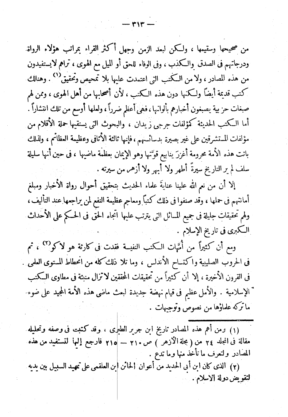 من صحيحها وسقيها، ولكن لبعد الزمن وجهل أكثر القراء بمراتب هؤلاء الرواة ودرجاتهم في الصدق والكذب، وفي الوفاء للحق أو الميل مع الهوى، تراهم لا يستفيدون من هذه المصادر ولا من الكتب التي اعتمدت عليها بلا تمحيص وتحقيق. (¬1) وهنالك كتب قديمة أيضا ولكنها دون هذه الكتب، لأن أصحابها من أهل الهوى، وممن لهم صبغات حزبية يصبغون أخبارهم بألوانها، فهي أعظم ضررا، ولعلها أوسع من تلك انتشارا. أما الكتب الحديثة كمؤلفات جرجي زيدان، والبحوث التي يستقيها حملة الأقلام من مؤلفات المستشرقين على غير بصيرة بدسائسهم، فإنها ثالثة الأثافي والعظائم، ولذلك باتت هذه الأمة محرومة أغزر ينابيع قوتها وهو الإيمان بعظمة ماضيها، في حين أنها سليلة سلف لم ير التاريخ سيرة أطهر ولا أبهر ولا أزهر من سيرته.
