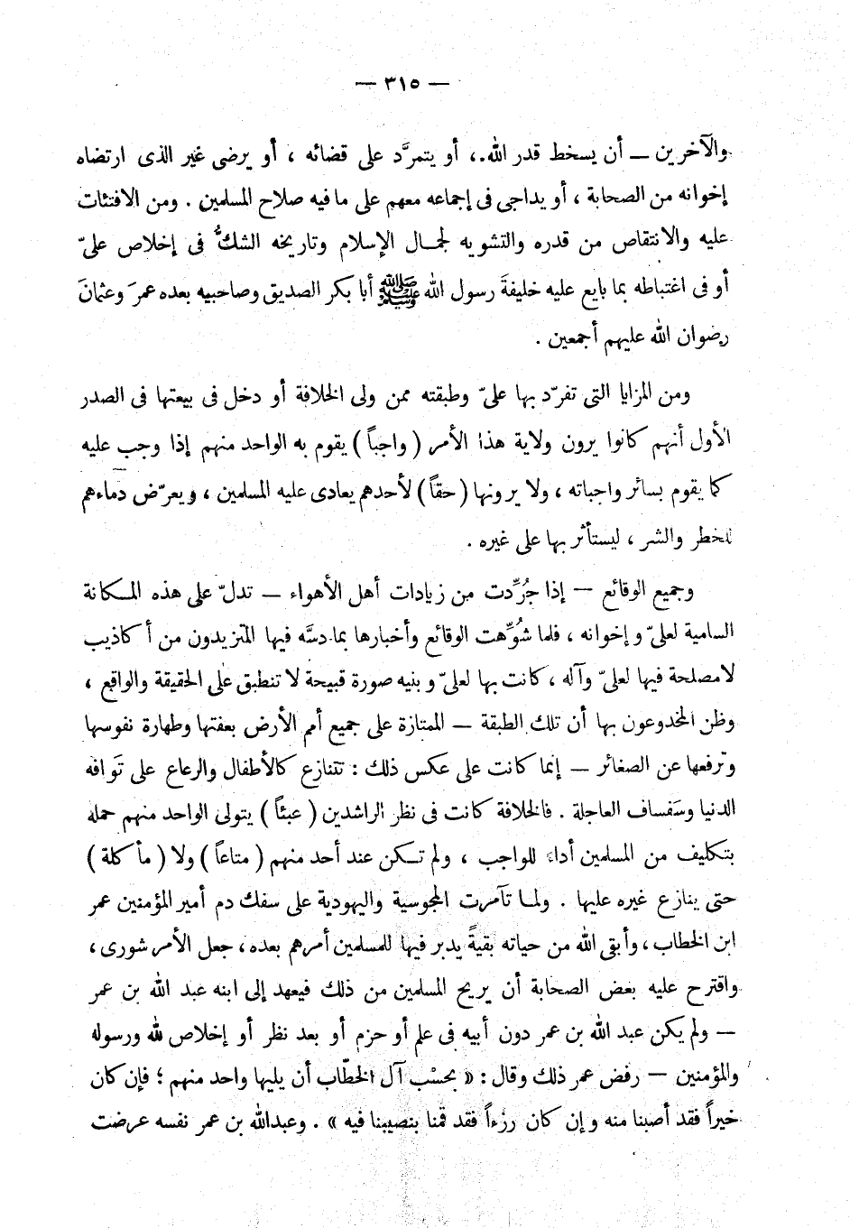 والآخرين - أن يسخط قدر الله، أو يتمرد على قضائه، أو يرضى غير الذي ارتضاه إخوانه من الصحابة، أو يداجي معهم على ما فيه صلاح المسلمين. ومن الافتئات عليه والانتقاص من قدره والتشويه لجمال الإسلام وتاريخه الشك في إخلاص علي أو في اغتباطه بما بايع عليه خليفة رسول الله - صلى الله عليه وسلم - أبا بكر الصديق وصاحبيه بعده عمر وعثمان رضوان الله عليهم أجمعين.