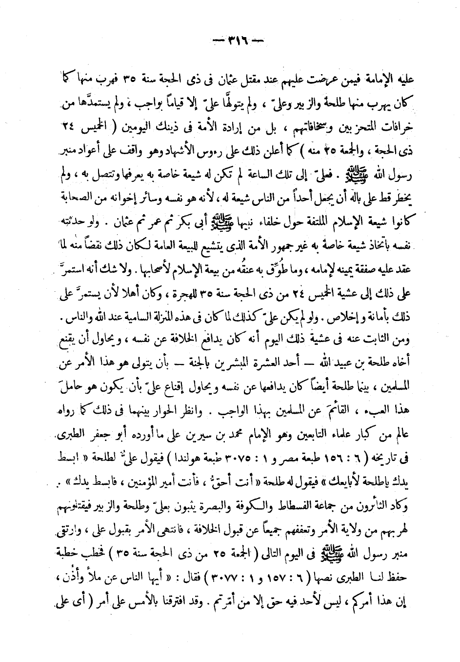 عليه الإمامة فيمن عرضت عليهم عند مقتل عثمان في ذي الحجة سنة 35 فهرب منها كما كان يهرب منها طلحة والزبير وعلي، ولم يتولها علي إلا قياما بواجب، ولم يستمدها من خرافات المنحرفين وسخافاتهم، بل من إرادة الأمة في ذينك اليومين (الخميس 24 ذي الحجة، والجمعة 25 منه) كما أعلن ذلك على رءوس الأشهاد وهو واقف على أعواد منبر رسول الله - صلى الله عليه وسلم -. فعلي إلى تلك الساعة لم تكن له شيعة خاصة به يعرفها وتتصل به، ولم يخطر قط على باله أن يجعل أحدا من الناس شيعة له، لأنه هو نفسه وسائر إخوانه من الصحابة كانوا شيعة الإسلام الملتفة حول خلفاء نبيها - صلى الله عليه وسلم - أبي بكر ثم عمر ثم عثمان. ولو حدثته نفسه باتخاذ شيعة خاصة به عند جمهور الأمة الذي يتشيع للبيعة العامة لكان ذلك نقصا منه لما عقد عليه صفقة يمينه لإمامه، وما طوق به من بيعة الإسلام لأصحابها، ولا شك أنه استمر على ذلك إلى عشية الخميس 24 من ذي الحجة سنة 35 للهجرة، كان أهلا لأن يستمر علي ذلك بأمانة وإخلاص. ولو لم يكن علي كذلك لما كان في هذه المنزلة السامية عند الله والناس. ومن الثابت عنه في عشية ذلك اليوم أنه كان يدافع الخلافة عن نفسه، ويحاول أن يقنع أخاه طلحة بن عبيد الله - أحد العشرة المبشرين بالجنة - بأن يتولى هو هذا الأمر عن المسلمين، بينما طلحة أيضا كان يدافعها عن نفسه ويحاول إقناع علي بان يكون هو حامل هذا العبء، القائم عن المسلمين بهذا الواجب. وانظر الحوار بينهما في ذلك كما رواه عالم من كبار علماء التابعين وهو الإمام محمد بن سيرين على ما أورده أبو جعفر الطبري في تاريخه (6: 156 طبعة مصر و 1: 3075 طبعة هولندا) فيقول علي لطلحة «ابسط يدك يا طلحة لأبايعك» فيقول له طلحة «أنت أحق، فأنت امير المؤمنين، فابسط يدك».