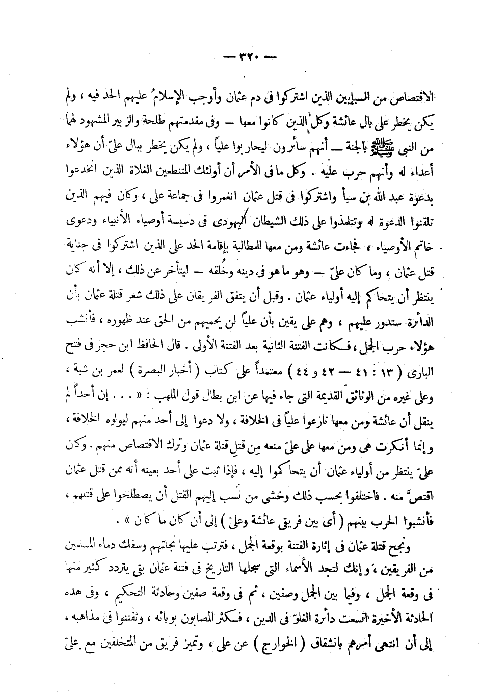 الاقتصاص من السبإيين الذين اشتركوا في دم عثمان وأوجب الإسلام عليهم الحد فيه، ولم يكن يخطر على بال عائشة وكل الذين كانوا معها - وفي مقدمتهم طلحة والزبير المشهود لهما من النبي - صلى الله عليه وسلم - بالجنة - أنهم سائرون ليحاربوا عليا، ولم يكن يخطر ببال علي أن هؤلاء أعداء له وأنهم حرب عليه. وكل ما في الأمر أن أولئك المتنطعين الغلاة لاذين انخدعوا بدعوة عبد الله بن سبا واشتركوا في قتل عثمان انغمروا في جماعة علي، وكان فيهم الذين تلقنوا الدعوة له وتتلمذوا على ذلك الشيطان اليهودي في دسيسة أوصياء الأنبياء ودعوى خاتم الأوصياء، فجاءت عائشة ومن معها للمطالبة بإقامة الحد على الذين اشتركوا في جناية قتل عثمان، وما كان علي - وهو ما هو في دينه وخلقه - ليتأخر عن ذلك، إلا أنه كان ينتظر أن يتحاكم إليه أولياء عثمان. وقبل أن يتفق الفريقان على ذلك شعر قتلة عثمان بأن الدائرة ستدور عليهم، وهم على يقين بأن عليا لن يحميهم من الحق عند ظهوره، فأنشب هؤلاء حرب الجمل، فكانت الفتنة الثانية بعد الفتنة الأولى. قال الحافظ ابن حجر في فتح الباري (13: 41 - 42 و 44) معتمدا على كتاب (أخبار البصرة) لعمر بن شبة، وعلى غيره من الوثائق القديمة التي جاء فيها عن ابن بطال قول الملهب: « ... .. إن أحدا لم ينقل أن عائشة ومن معها نازعوا عليا في الخلافة، ولا دعوا إلى أحد منهم ليولوه الخلافة وإنما أنكرت هي ومن معها على علي منعه من قتل قتلة عثمان وترك الاقتصاص منهم. وكان علي ينتظر من أولياء عثمان أن يتحاكموا إليه، فإذا ثبت على أحد بعينه أنه ممن قتل عثمان اقتص منه. فاختلفوا بحسب ذلك وخشي من نسب إليهم القتل أن يصطلحوا على قتلهم، فأنشبوا الحرب بينهم (أى بين فريقي عائشة وعلي) إلى أن كان ما كان».