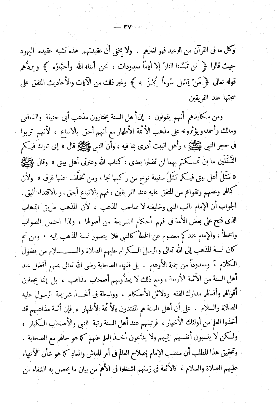 على أن أهل السنة هم المقتدون بالأئمة الأطهار، فإن أئمة مذاهبهم قد أخذوا العلم من أولئك الأخيار، فرتبتهم عند أهل السنة رتبة النبي والأصحاب الكبار، ولكن لا ينسبون أنفسهم إليهم، ولا يدعون أخذ العلم عنهم كما هو حالهم مع الصحابة. وتحقيق هذا المطلب أن منصب الإمام إصلاح العالم في أمر المعاش والمعاد كما هو شأن الأنبياء عليهم الصلاة والسلام، فالأئمة في زمنهم اشتغلوا في ألهم من بيان ما يحصل به الشفاء من