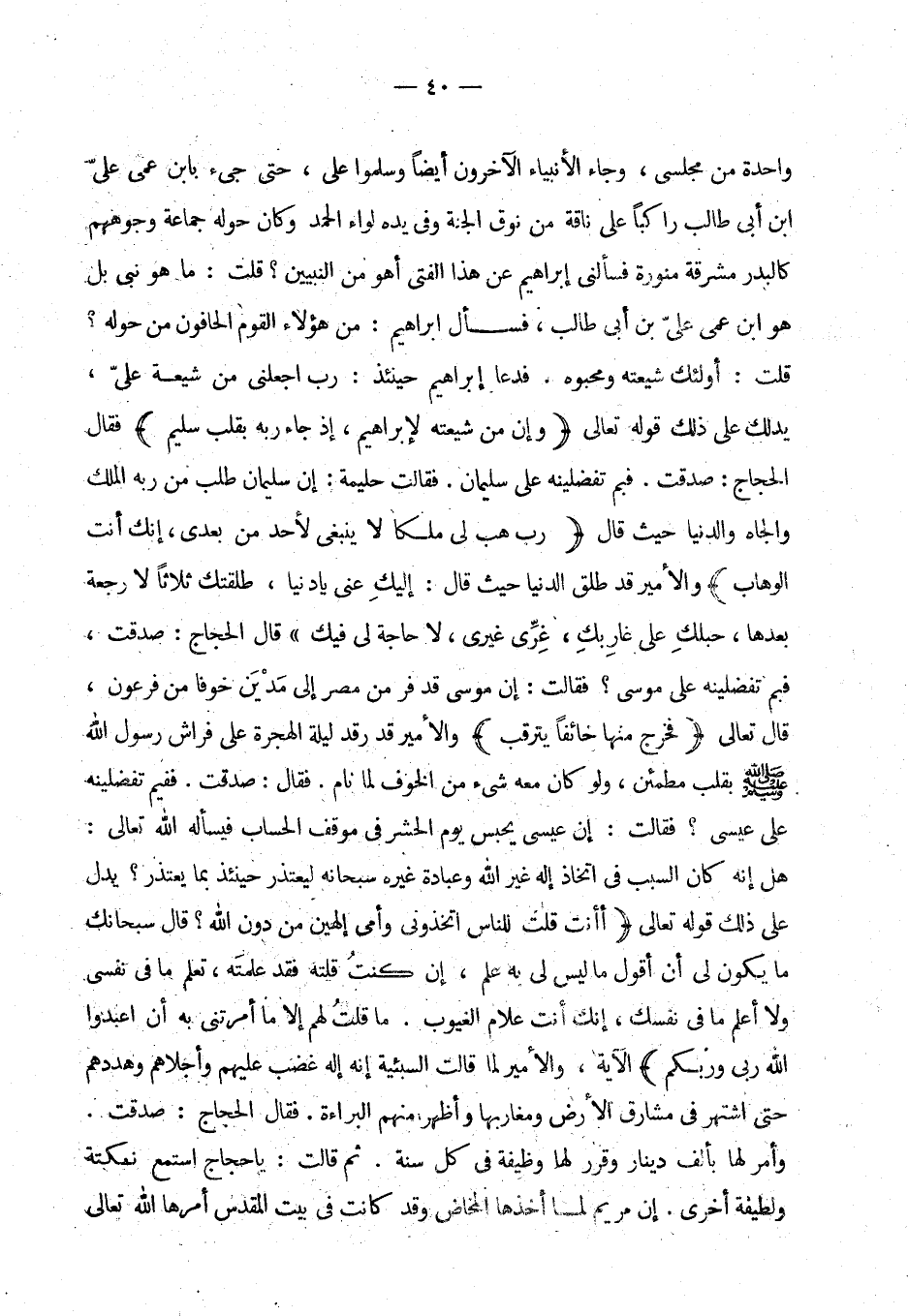 واحدة من مجلسي، وجاء الأنبياء الآخرون أيضا وسلموا علي، حتى جئ بابن عمى علي ابن أبي طالب راكبا على ناقة من نوق الحنة وفي يده لواء الحمد وكان حوله جماعة وجوههم كالبدر مشرقة منورة فسألتي إبراهيم عن هذا الفتى أهو من النبيين؟ قلت: ما هو نبي بل هو ابن عمي علي بن أبي طالب، فسأل إبراهيم: من هؤلاء القوم الحافون من حوله؟ قلت: أولئك شيعته ومحبوه. فدعا إبراهيم حينئذ: رب أجعلني من شيعة علي، يدلك على ذلك قوله تعالى {وإن من شيعته لإبراهيم إذ جاء ربه بقلب سليم} فقال الحجاج: صدقت. فبم تفضلينه على سليمان. فقالت حليمة: إن سليمان طلب من ربه الملك والجاه والدنيا حيث قال {رب هب لي ملكا لا ينبغي لأحد من بعدي إنك أنت الوهاب} والأمير قد طلق الدنيا حيث قال: إليك عني يا دنيا، طلقتك ثلاثا لا رجعة بعدها، حبلك على غاربك، غري غيري، ولا حاجة لي فيك». (¬1) قال الحجاج: صدقت، فيم تفضلينه على موسى؟ فقالت: إن موسى قد فر من مصر إلى مدين خوفا من فرعون، قال تعالى {فخرج منها خائفا يترقب} والأمير قد رقد ليلة الهجرة على فراش رسول الله - صلى الله عليه وسلم - بقلب مطمئن، ولو كان معه شئ من الخوف لما نام. فقال: صدقت.