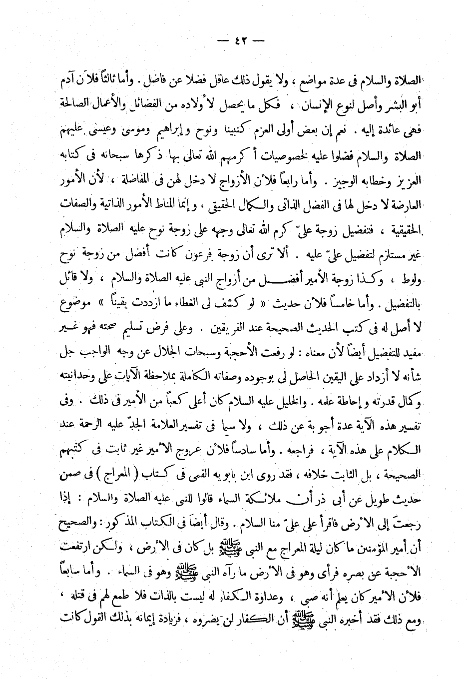 الصلاة والسلام - في عدة مواضع، ولا يقول ذلك عاقل فضلا عن فاضل. وأما ثالثا فلأن آدم أبو البشر وأصل لنوع الإنسان، فكل ما يحصل لأولاده من الفضائل والأعمال الصالحة فهي عائدة إليه. نعم إن بعض أولي العزم كنبينا ونوح وإبراهيم وموسى وعيسى عليهم الصلاة والسلام، فضلوا عليه لخصوصيات أكرمهم الله تعالى بها ذكرها سبحانه في كتابه العزيز وخطابه الوجيز. وأما رابعا فلأن الأزواج لا دخل لهن في المفاضلة، لأن الأمور العارضة لا دخل لها في الفضل الذاتي والكمال الحقيقي، وإنما المناط الأمور الذاتية والصفات الحقيقية، فتفضيل زوجة علي كرم الله تعالى وجهه على زوجة نوح - عليه الصلاة والسلام - غير مستلزم لتفضيل علي عليه. ألا ترى أن زوجة فرعون كانت أفضل من زوجة نوح ولوط، وكذا زوجة الأمير أفضل من أزواج النبي - صلى الله عليه وسلم -، ولا قائل بالتفضيل. وأما خامسا فلأن حديث «لو كشف لي الغطاء ما أزددت يقينا» موضوع لا أصل له في كتب الحديث الصحيحة عند الفريقين. وعلى فرض تسليم صحته فهو غير مفيد للتفضيل أيضا لأن معناه: لو رفعت الأحجبة وسبحات الجلال عن وجه الواجب جل شأنه لا أزداد على اليقين الحاصل لي بوجوده وصفاته الكاملة بملاحظة الآيات على وحدانيته وكمال قدرته وإحاطة علمه. والخليل - عليه السلام - كان أعلى كعبا من الأمير في ذلك. وفي تفسير هذه الآية عدة أجوبة عن ذلك، ولا سيما في تفسير العلامة الجد عليه الرحمة عند الكلام على هذه الآية، فراجعه. (¬1)