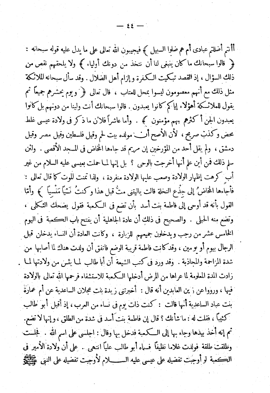 أأنتم أضللتم عبادي أم هم ضلوا السبيل} فيجيبون الله تعالى على ما يدل عليه قوله سبحانه: {قالوا سبحانك ما كان ينبغي لنا أن نتخذ من دونك أولياء} ولا يلحقهم نقص من ذلك السؤال إذ القصد تبكيت الكفرة وإلزام أهل الضلال. وقد سأل سبحانه الملائكة مثل ذلك مع أنهم معصومون ليسوا بمحل للعتاب، قال تعالى {ويوم يحشرهم جميعا ثم يقول للملائكة أهؤلاء إياكم كانوا يعبدون قالوا سبحانك أنت ولينا من دونهم بل كانوا يعبدون الجن أكثرهم بهم مؤمنون}. وأما عاشرا فلأن ما ذكر في ولادة عيسى غلط محض وكذب صريح لأن الأصح أن مولده بيت لحم وفلسطين وقيل مصر وقيل دمشق ولم يقل أحد المؤرخين إن مريم قد جاءها المخاض في المسجد الأقصى ولئن سلم ذلك فمن أين علم أنها أخرجت بالوحي؟ بل إنها لما حملت بعيسى - عليه السلام - من غير أب كرهت إظهار الولادة منفردة ولذا تمنت الموت كما قال تعالى: {فأجاءها المخاض إلى جذع النخلة قالت يا ليتني مت قبل هذا وكنت نسيا منسيا} وأما القول بأنه قد أوحي إلى فاطمة بنت أسد بأن تضع في الكعبة فقول يضحك الثكلى وتضع منه الحبلى، والصحيح في ذلك أن عادة الجاهلية أن يفتح باب الكعبة في البوم الخامس عشر من رجب ويدخلون جميعهم للزيارة وكانت العادة أن النساء يدخلن قبل الرجال بيوم أو يومين وقد كانت فاطمة قريبة الوضع فاتفق أن ولدت هناك لما أصابها من شدة المزاحمة والمجاذبة وقد ورد في كتب الشيعة أن أبا طالب لما يئس من ولادتها لما زادت المدة المعلومة لما عراها من المرض أدخلها الكعبة للاستشفاء فرحمها الله تعالى بالولادة فيها ورووا عن زين العابدين أنه قال: أخبرتني زيدة بنت عجلان الساعدية عن أم عمارة بنت عباد الساعدية أنها قالت: كنت ذات يوم في نساء من العرب إذ أقبل أبو طالب كئيبا فقلت له: ما شأنك؟ قال إن فاطمة بنت أسد في شدة من الطلق وإنها لا تضع ثم إنه أخذ بيدها وجاء بها إلى الكعبة فدخل بها وقال: اجلسي على اسم الله فجلست وطلقت طلقة فولدت غلاما نظيفا فسماه أبو طالب عليا. (¬1) انتهى.