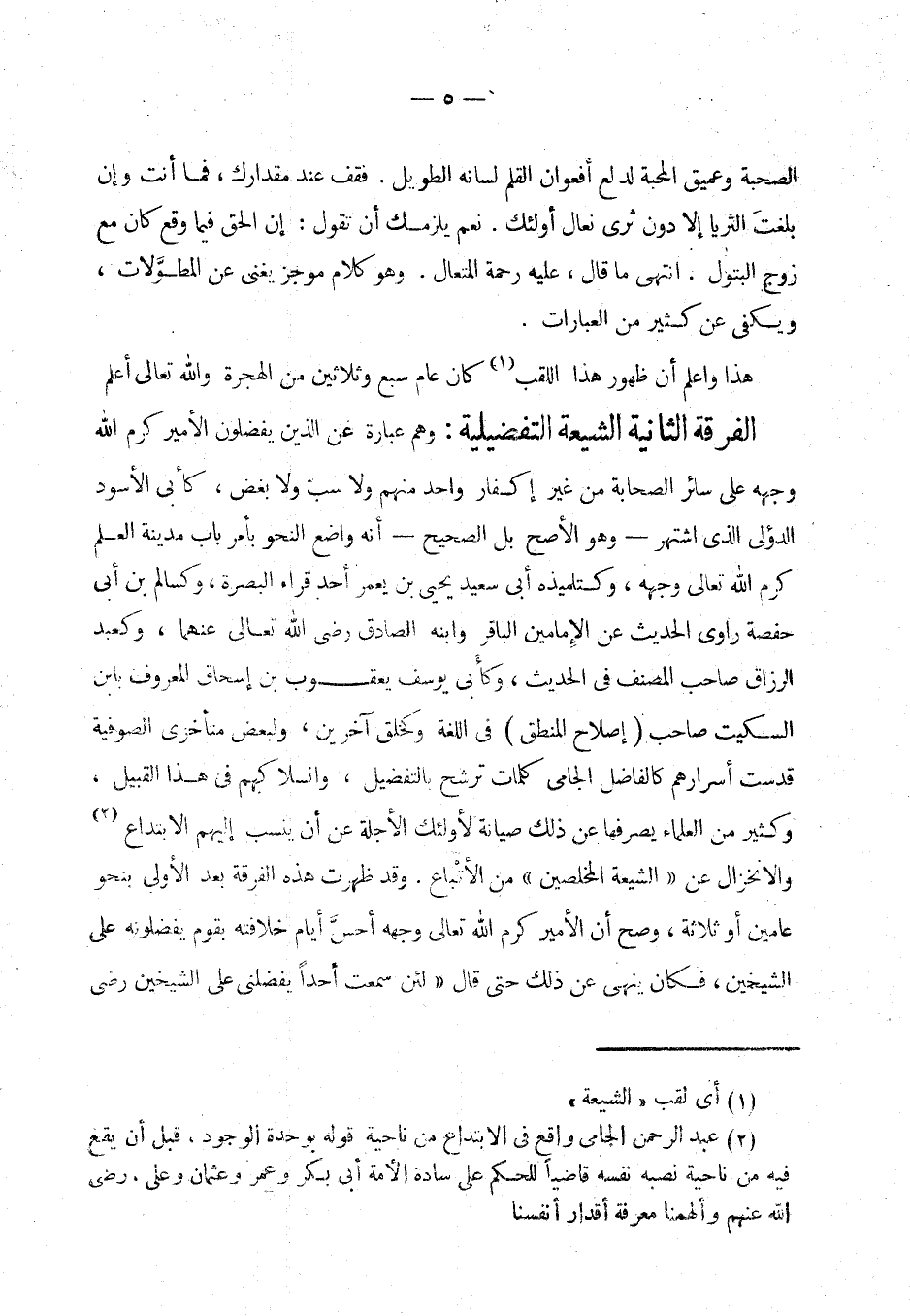 الفرقة الثانية الشيعة التفضيلية: وهم عبارة عن الذين يفضلون الأمير كرم الله وجهه على سائر الصحابة من غير إكفار واحد منهم ولا سب ولا بغض، كأبي الأسود الدؤلي الذي اشتهر - وهو الأصح بل الصحيح - أنه واضع النحو بأمر باب مدينة العلم كرم الله تعالى وجهه، وكتلميذه أبي سعيد يحيى بن يعمر أحد قراء البصرة، وكسالم بن أبي حفصة راوي الحديث عن الإمامين الباقر وابنه الصادق - رضي الله تعالى عنهما -، وكعبد الرزاق صاحب المصنف في الحديث، وكأبي يوسف يعقوب بن إسحاق المعروف بابن السكيت صاحب (إصلاح المنطق) في اللغة وكخلق آخرين، ولبعض متأخري الصوفية قدست أسرارهم كالفاضل الجامي كلمات ترشح بالتفضيل، وانسلاكهم في هذا القبيل، وكثير من العلماء يصرفها عن ذلك صيانة لأولئك الأجلة عن أن ينسب إليهم الابتداع (¬2) والانخزال عن «الشيعة المخلصين» من الأتباع. وقد ظهرت هذه الفرقة بعد الأولى بنحو عامين أو ثلاثة، وصح أن الأمير كرم الله تعالى وجهه أحس أيام خلافته بقوم يفضلونه على الشيخين، فكان ينهى عن ذلك حتى قال «لئن سمعت أحدا يفضلني على الشيخين - رضي