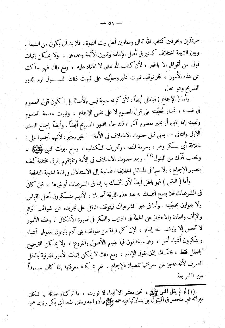 وأيضا إجماع الصدر الأول والثاني - يعني قبل حدوث الاختلاف في الأمة - غير معتبر، لأنهم أجمعوا على: خلافة أبي بكر وعمر، وحرمة المتعة، وتحريف الكتاب، ومنع ميراث النبي - صلى الله عليه وسلم -، وغضب فدك من البتول. (¬3) وبعد حدوث الاختلاف في الأمة وتفرقهم بفرق مختلفة كيف يتصور الإجماع، ولا سيما في المسائل الخلافية المحتاجة إلى الاستدلال وإقامة الحجة القاطعة.