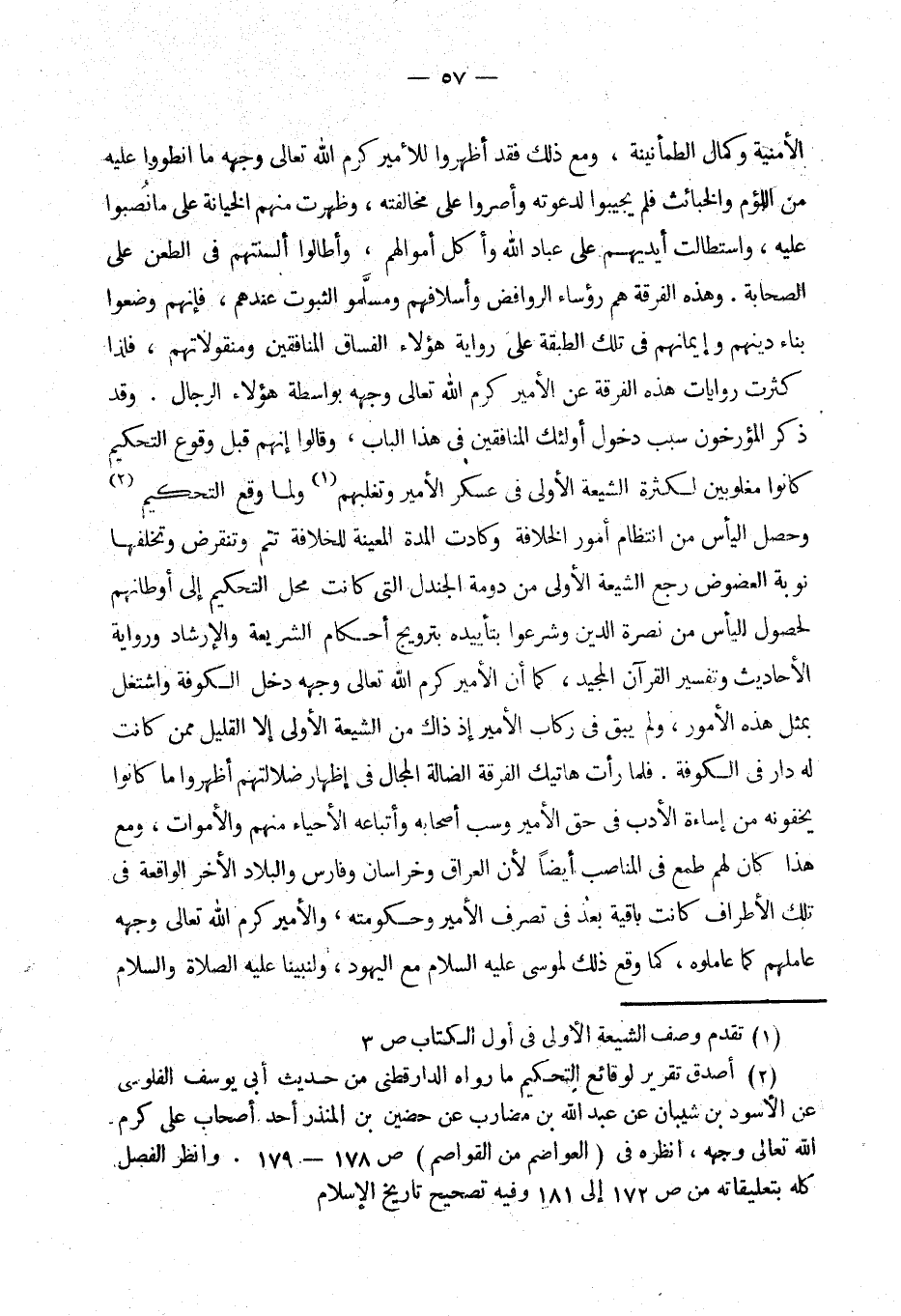 وهذه الفرقة هم رؤساء الروافض وأسلافهم ومسلَّمو الثبوت عندهم. فإنهم وضعوا بناء دينهم وإيمانهم في تلك الطبقة على رواية هؤلاء الفساق المنافقين ومنقولاتهم، فلذا كثرت روايات هذه الفرقة عن الأمير كرم الله تعالى وجهه بواسطة هؤلاء الرجال. وقد ذكر المؤرخون سبب دخول أولئك المنافقين في هذا الباب، وقالوا إنهم قبل وقوع التحكيم كانوا مغلوبين لكثرة الشيعة الأولى في عسكر الأمير وتغلبهم (¬2) ولما وقع التحكيم وحصل اليأس من انتظام أمور الخلافة وكادت المدة المعينة للخلافة تتم وتنقرض وتخلفها نوبة العضوض رجع الشيعة الأولى من دومة الجندل التي كانت محل التحكيم إلى أوطانهم لحصول اليأس من نصرة الدين وشرعوا بتأييده بترويج أحكام الشرعية والإرشاد ورواية الأحاديث وتفسير القرآن المجيد، كما أن الأمير كرم الله تعالى وجهه دخل الكوفة واشتغل بمثل هذه الأمور، ولم يبق في ركاب الأمير إذ ذاك من الشيعة الأولى إلا القليل ممن كانت له في دار الكوفة. فلما رأت هاتيك الفرقة الضالة المجال في إظهار ضلالتهم أظهروا ما كانوا يخفونه من إساءة الأدب في حق الأمير وسب أصحابه وأتباعه الأحياء منهم والأموات. ومع هذا كان لهم طمع في المناصب أيضا لأن العراق وخراسان وفارس والبلاد الأخرى الواقعة في تلك الأطراف كانت باقية بعد في تصرف الأمير وحكومته، والأمير كرم الله تعالى وجهه عاملهم، كما عاملوه، كما وقع ذلك لموسى - عليه السلام -، ولنبينا - عليه الصلاة والسلام -،