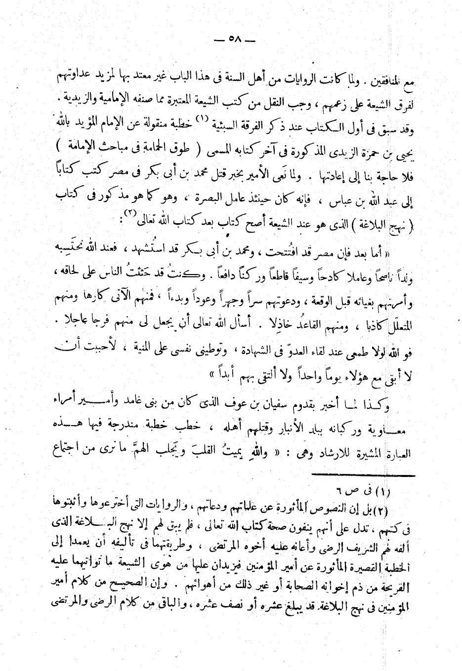 (¬2) بل إن النصوص المأثورة عن علمائهم ودعاتهم، والروايات التي اخترعوها وأثبتوها في كتبهم، تدل على أنهم ينفون صحة كتاب الله تعالى، فلم يبق لهم إلا نهج البلاغة الذي ألفه لهم الشريف الرضي وأعانه عليه أخوه المرتضى، وطريقتهما في تأليفه أن يعمدا إلى الخطبة القصيرة المأثورة عن أمير المؤمنين فيزيدان عليها من هوى الشيعة ما تواتيهما عليه القريحة من ذم إخوانه الصحابة أو غير ذلك من أهوائهم. وإن الصحيح من كلام أمير المؤمنين في نهج البلاغة قد يبلغ عشره أو نصف عشره، والباقي من كلام الرضي والمرتضى