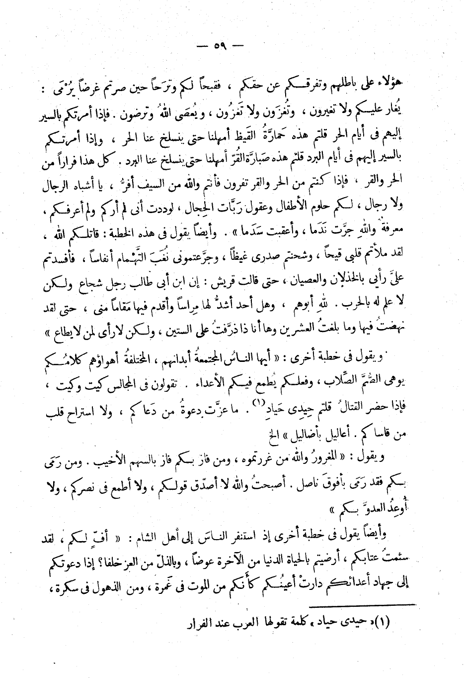 ويقول في خطبة أخرى: «أيها الناس المجتمعة أبدانهم، المختلفة أهواؤهم، كلامكم يوهي الصم الصلاب، وفعلكم يطمع فيكم الأعداء. تقولون في المجالس كيت وكيت، فإذا حضر القتال قلتم حيدي حياد. ما عزت دعوة من دعاكم، ولا استراح قلب من قاساكم. أعاليل بأضاليل» إلخ. (¬10)