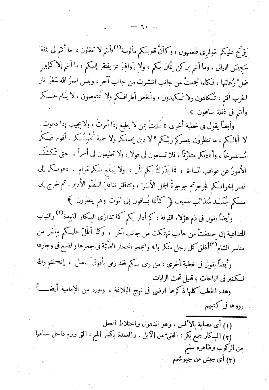 وأيضا يقول في ذم هؤلاء الفرقة: كم أدار يكم كما تدارى البكار العمدة (¬11) والثياب المتداعية إن حيضت من جانب تهتكت من جانب آخر، وكلما أطل عليكم منسر من ناسر الشام (¬12) أغلق كل رجل منكم بابه وانحجر انحجار الضبة في جحرها والضبع في وجارها (¬13)