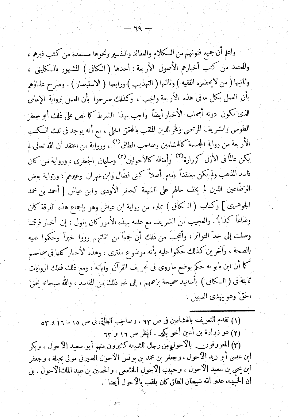 واعلم أن جميع فنونهم في الكلام والعقائد والتفسير ونحوها مستمدة من كتب غيرهم. والمعتمد من كتب أخبارهم الأصول الأربعة: أحدها (الكافي) المشهور بالكليني، وثانيها (من لا يحضره الفقيه) وثالثها (التهذيب) ورابعها (الاستبصار). وصرح علماؤهم بأن العمل بكل ما في هذه الأربعة واجب، وكذلك صرحوا بأن العمل برواية الإمامي الذي يكون دونه أصحاب الأخبار أيضا واجب بهذا الشرط كما نص على ذلك أبو جعفر الطوسي والشريف المرتضى وفخر الدين الملقب بالمحقق الحلي، (¬1) مع أنه يوجد في تلك الكتب الأربعة من رواية المجسمة كالهشامين وصاحب الطاق، ورواية من اعتقد أن الله تعالى لم يكن عالما في الأزل كزرارة وأمثاله كالأحولين (¬2) وسليمان الجعفري، ورواية من كان فاسد المذهب ولم يكن معتقدا بإمام أصلا كبني فضّال وابن مهران وغيرهم، ورواية بعض الوضاعين الذين لم يخف حالهم على الشيعة كجعفر الأودي (¬3) وابن عياش (¬4) وكتاب (الكافي) مملوء من رواية ابن عياش وهو بإجماع هذه الفرقة كان وضاعا كذابا.