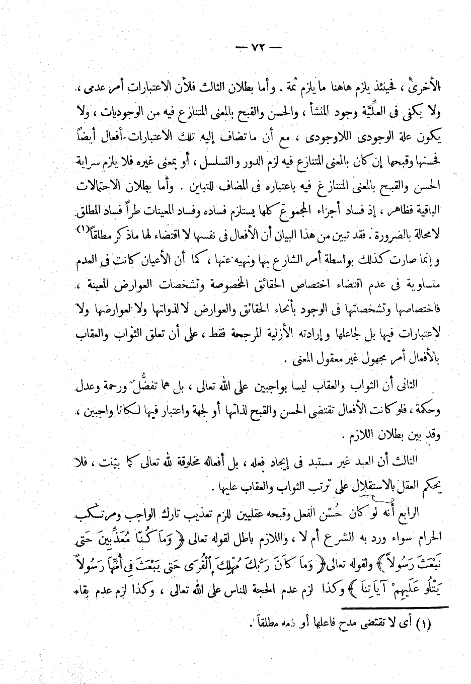 وأما بطلان الثالث فلأن الاعتبارات أمر عدمي ولا يكفي في العلّية وجود المنشأ، والحسن والقبح بالمعنى فيه من الوجوديات، ولا يكون علة الوجودي اللاوجودي، مع أن تضاف إليه تلك الإعتبارات أفعال أيضا فحسنها وقبحها إن كان بالمعنى المتنازع فيه لزم الدور والتسلسل، (¬2) أو بمعنى غيره فلا يلزم سراية الحسن والقبح بالمعنى المتنازع فيه باعتباره في المضاف للتباين. وأما بطلان الاحتمالات الباقية فظاهر، إذ فساد أجزاء المجموع كلها يستلزم فساده وفساد المعينات طرأ فساد المطلق ولا محالة بالضرورة. فقد تبين من هذا البيان أن الأفعال في نفسها لا اقتضاء لها ما ذكر مطلقا (¬3) وإنما صارت كذلك بواسطة أمر الشارع بها ونهيه عنها، (¬4) كما أن الأعيان كانت في العدم فاختصاصها وتشخصاتها في الوجود بانحاء الحقائق والعوارض لا لذواتها ولا لعوارضها ولا لاعتبارات فيها بل لجاعلها وإرادته الأزلية المرجحة فقط، على أن تعلق الثواب والعقاب بالأفعال أمر مجهول غير معقول المعنى.