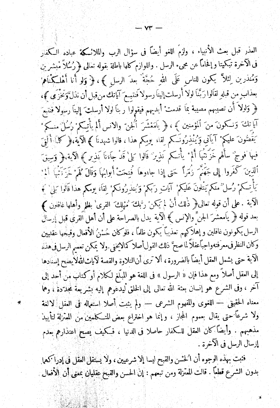 العذر قبل بعث الأنبياء، ولزم اللغو أيضا في سؤال الرب والملائكة عبادة الكفار في الآخرة تبكيتا وإفحاما عن مجئ الرسل. واللوازم كلها باطلة بقوله تعالى {رسلا مبشرين ومنذرين لئلا يكون للناس على الله حجة بعد الرسل}، (¬1) {ولو أنا أهلكناهم بعذاب من قبله لقالوا لولا أرسلت إلينا رسولا فنتبع آياتك من قبل أن نذل ونخزى} {ولولا أن تصيبهم مصيبة بما قدمت أيديهم فيقولوا ربنا لولا أرسلت إلينا رسولا فنتبع آياتك ونكون من المؤمنين}، {يا معشر الجن والإنس ألم يأتكم رسل منكم يقصون عليكم آياتي وينذرونكم لقاء يومكم هذا قالوا شهدنا} الآية، {كلما ألقي فيها فوج سألهم خزنتها ألم ياتكم نذير قالوا بلى قد جاءنا نذير} الآية، {وسيق الذين كفروا إلى جهنم زمرا حتى إذا جاءوها فتحت أبوابها وقال لهم خزنتها ألم يأتكم رسل منكم يتلون عليكم آيات ربكم وينذرونكم لقاء يومكم هذا قالوا بلى} الآية. على أن قوله تعالى {ذلك أن لم يكن ربك مهلك القرى بظلم وأهلها غافلون} بعد قوله {يا معشر الجن والإنس} الآية يدل بالصراحة على أن أهل القرى قبل إرسال الرسل يكونون غافلين وإهلاكهم تعذيبا يكون ظلما، فلو كان حسن الأفعال وقبحها عقليين وكان النظر في معرفته واجبا عقلا لما صح ذلك القول أصلا كما لا يخفى. ولا يمكن تعميم الرسل في هذه الآية حتى يشمل العقل أيضا بالضرورة. ألا ترى أن التلاوة والقصة لآيات الله لا يصح إسنادها إلى العقل أصلا ومع هذا فإن «الرسول» في اللغة هو المبلغ لكلام أو كتاب من أحد إلى آخر، وفي الشرع هو إنسان بعثه الله تعالى إلى الخلق ليدعوهم إليه بشريعة مجددة، وهما معناه الحقيقي - اللغوي والمفهوم الشرعي - ولم يثبت أصلا استعماله في العقل لا لغة ولا شرعا حتى يقال بعموم المجاز، وإنما هو اختراع بعض المتكلمين من المعتزلة لتأييد مذهبهم. وأيضا كان العقل للكفار حاصلا في الدنيا، فكيف يصح اعتذارهم بعدم إرسال الرسل في الآخرة.
