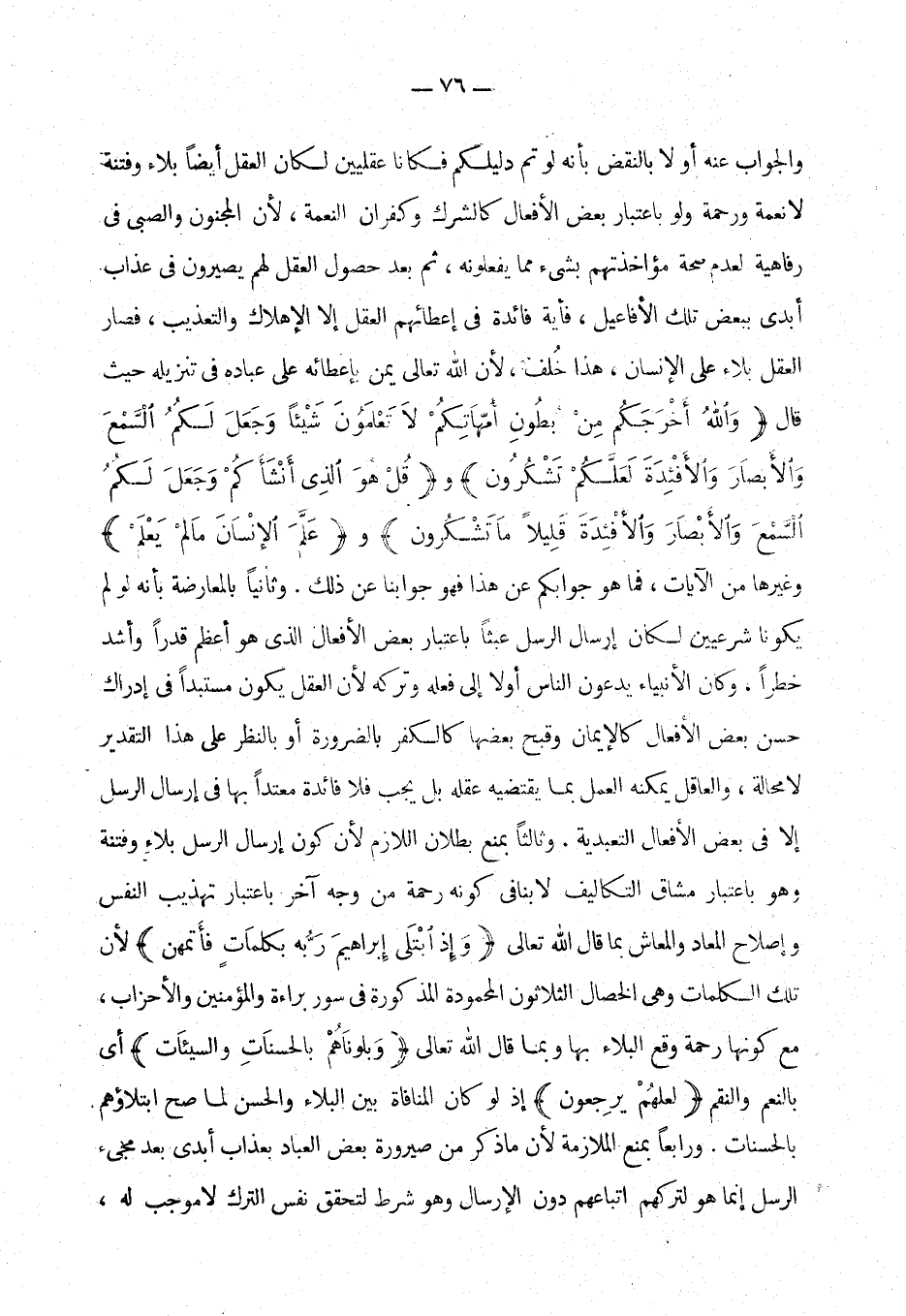 والجواب عنه أولا بالنقض بأنه لو تم دليلكم فكانا عقليين لكان العقل أيضا بلاء وقتنة لا نعمة ورحمة ولو باعتبار بعض الأفعال كالشرك وكفران النعمة، لأن المجنون والصبي في رفاهية لعدم صحة مؤاخذتهم بشئ مما يفعلونه، ثم بعد حصول العقل لهم يصيرون في عذاب أبدي ببعض تلك الأفاعيل، فأية فائدة في إعطائهم إلا الإهلاك والتعذيب، فصار العقل بلاء على الإنسان، هذا خلف، لأن الله تعالى يمن بإعطائه على عباده في تنزيله حيث قال {والله أخرجكم من بطون أمهاتكم لا تعلمون شيئا وجعل لكم السمع والأبصار والأفئدة لعلكم تشكرون} و {قل هو الذي أنشاكم وجعل لكم السمع والأبصار والأفئدة قليلا ما تشكرون} و {علم الإنسان ما لم يعلم} (¬1) وغيرها من الآيات، فما هو جوابكم عن هذا فهو جوابنا عن ذلك. ثانيا بالمعارضة بأنه لو لم يكونا شرعيين لكان إرسال الرسل عبثا باعتبار بعض الأفعال الذي هو أعظم قدرا وأشد خطرا، وكان الأنبياء يدعون الناس أولا إلى فعله وتركه لأن العقل يكون مستبدا في إدراك حسن بعض الأفعال كالإيمان وقبح بعضها كالكفر بالضرورة أو بالنظر على هذا التقدير لا محالة، والعاقل يمكنه العمل بما يقتضيه عقله بل يجب فلا فائدة معتدا بها في إرسال الرسل إلا في بعض الأفعال التعبدية. وثالثا بمنع بطلان اللازم كون إرسال الرسل بلاء وفتنة وهو باعتبار مشاق التكاليف لا ينافي كونه رحمة من وجه آخر باعتبار تهذيب النفس وإصلاح المعاد والمعاش بما قال الله تعالى {وإذ ابتلى إبراهيم ربه بكلمات فأتمهن} لأن تلك الكلمات وهي الخصال الثلاثون المحمودة المذكورة في سورة براءة والمؤمنين والأحزاب مع كونها رحمة وقع البلاء بها وبما قال الله تعالى {وبلوناهم بالحسنات والسيئات} أي بالنعم والنقم {لعلهم يرجعون} إذ لو كان المنافاة بين البلاء والحسن لما صح ابتلاؤهم بالحسنات.