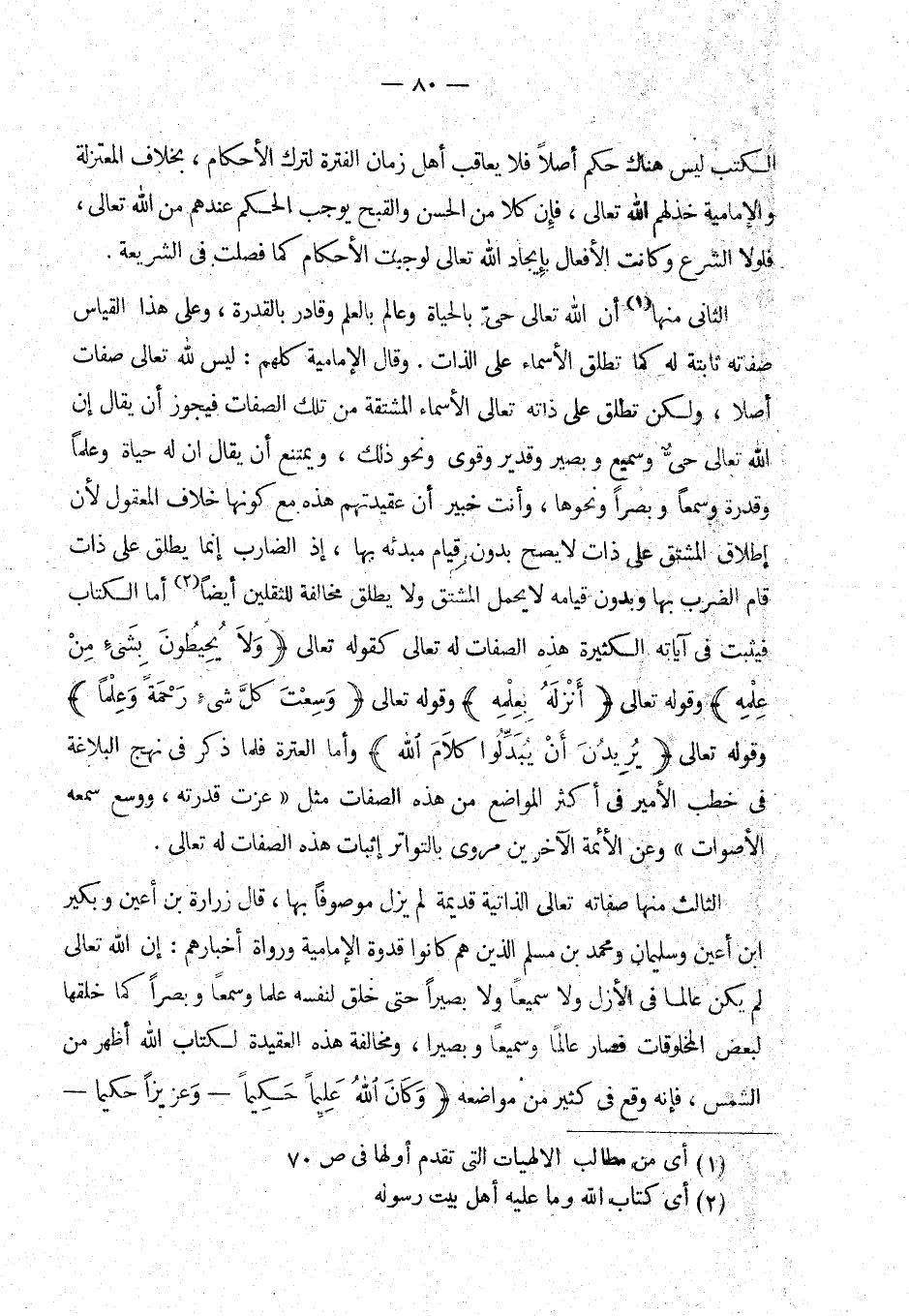 الثاني منها (¬1) أن الله تعالى حي بالحياة وعالم بالعلم وقادر بالقدرة، وعلى هذا القياس صفته ثابتة له كما تطلق الأسماء على الذات. وقال الإمامية كلهم: ليس لله تعالى صفات أصلا، ولكن تطلق على ذاته تعالى الأسماء المشتقة من تلك الصفات فيجوز أن يقال إن الله تعالى حي وسميع وبصير وقدير وقوي ونحو ذلك، ويمتنع أن يقال أن له حياة وعلما وقدرة وسمعا وبصرا ونحوها، وأنت خبير أن عقيدتهم هذه مع كونها خلاف المعقول لأن إطلاق المشتق على ذات لا يصح بدون قيام مبدئه بها، إذ الضارب إنما يطلق على ذات قام الضرب بها، وبدون قيامه لا يحمل المشتق ولا يطلق مخالفة للثقلين أيضا (¬2) أما الكتاب فيثبت في آياته الكثيرة هذه الصفات له تعالى كقوله تعالى {ولا يحيطون بشئ من علمه} وقوله تعالى {أنزله بعلمه} وقوله تعالى {وسعت كل شيء رحمة وعلما} وقوله تعالى {يريدن أن يبدلوا كلام الله} - وأما العترة فلما ذكر في نهج البلاغة في خطب الأمير في أكثر المواضع من هذه الصفات مثل «عزت قدرته، ووسع سمعه الأصوات» (¬3) وعن الأئمة الآخرين مروي بالتواتر إثبات هذه الصفات له تعالى.