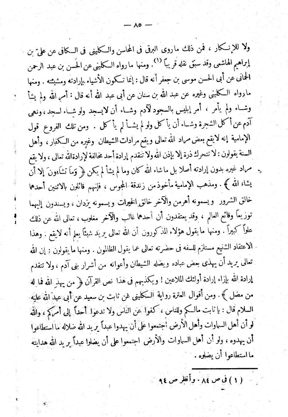 ومن تلك الفروع قول الإمامية، إنه لا يقع بعض مراد الله تعالى ويقع مرادات الشيطان وغيره من الكفار، وأهل السنة يقولون: لا تتحرك ذرة إلا بإذن الله ولا تتقدم إرادة أحد مخالفة لإرادة الله تعالى، ولا يقع مراد غيره بدون إرادته أصلا بل ما يشاء الله كان وما لم يشأ لم يكن {وما تشائون إلا أن يشاء الله}. ومذهب الإمامية مأخوذ من زندقة المجوس، فإنهم قائلون بالاثنين أحدهما خالق الشرور ويسمونه أهرمن والآخر خالق الخيرات ويسمونه يزدان، ويسندون إليهما توزيعًا وقائع العالم، وقد يعتقدون أن أحدهما غالب على الآخر مغلوب، تعالى الله عن ذلك علوا كبيرا. ومنها ما يقول هؤلاء المذكورون أن الله تعالى يريد شيئا يعلم أنه لا يقع. وهذا الاعتقاد الشنيع مستلزم للسفه في حضرته تعالى عما يقول الظالمون. ومنها ما يقولون: إن الله تعالى يريد أن يهدي بعض عباده ويضله الشيطان وأعوانه من أشرار بنى آدم، ولا تتقدم إرادة الله بإزاء أولئك الملاعين! ويكذبهم في هذا نص القرآن {من يهد الله فما له من مضل}. ومن أقوال العترة رواية الكليني عن ثابت بن سعيد عن أبي عبد الله - عليه السلام - قال: يا ثابت ما لكم والناس، كفوا عن الناس ولا تدعوا أحدا إلى أمركم، والله لو أن أهل السماوات وأهل الأرض اجتمعوا على أن يهدوا عبدا يريد الله ضلاله ما استطاعوا أن يهدوه، ولو أن أهل السماوات والأرض اجتمعوا على أن يضلوا عبدا يريد الله هدايته ما استطاعوا أن يضلوه. (¬3)
