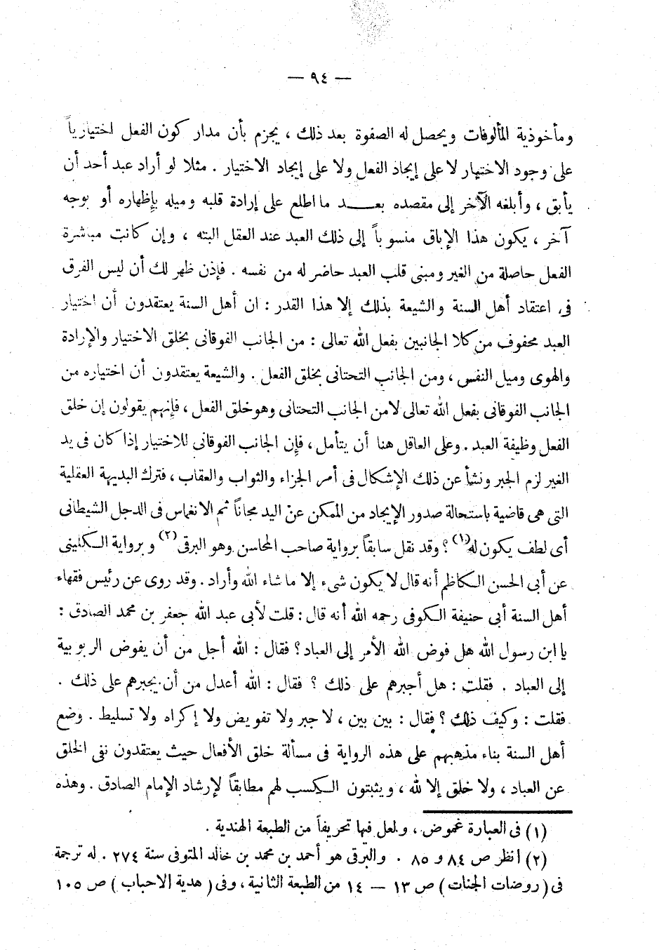 فإذن ظهر لك أن ليس الفرق في اعتقاد أهل السنة والشيعة بذلك إلا هذا القدر: إن أهل السنة يعتقدون أن اختيار العبد محفوف من كلا الجانبين بفعل الله تعالى: من الجانب الفوقاني بخلق الاختيار والإرادة والهوى وميل النفس، ومن الجانب التحتاني بخلق الفعل. والشيعة يعتقدون أن اختياره من الجانب الفوقاني بفعل الله تعالى لا من الجانب التحتاني وهو خلق الفعل فإنهم يقولون إن خلق الفعل وظيفة العبد. وعلى العاقل هنا أن يتأمل، فإن الجانب الفوقاني للاختيار إذا كان في يد الغير لزم الجبر ونشأ الإشكال في أمر الجزاء والثواب والعقاب، فترك البديهة العقلية التي هي قاضية باستحالة صدور الإيجاد من الممكن عن اليد مجانا ثم الانغماس في الدجل الشيطاني أي لطف يكون له؟ (¬1) وقد نقل سابقا برواية صاحب المحاسن وهو البرقي (¬2) وبرواية الكليني عن أبي الحسن الكاظم أنه قال لا يكون شيء إلا ما شاء الله وأراد. وقد روي عن رئيس فقهاء أهل السنة أبي حنيفة الكوفي أنه قال: قلت لأبي جعفر بن محمد الصادق: يا ابن رسول الله هل فوض الله الأمر إلى العباد؟ فقال: الله أجل من أن يفوض الربوبية إلى العباد. فقلت: هل أجبرهم على ذلك؟ فقال: الله أعدل من أن يجبرهم على ذلك. فقلت: وكيف ذلك؟ فقال: الله أعدل من أن يجبرهم على ذلك. فقلت: كيف ذلك؟ فقال: بين بين، لا جبر ولا تفويض ولا إكراه ولا تسليط. (¬3) وضع أهل السنة بناء مذهبهم على هذه الرواية في مسألة خلق الأفعال، حيث يعتقدون نفي الخلق عن العباد ولا خلق إلا لله، ويثبتون الكسب لهم مطابقا لإرشاد الإمام الصادق. وهذه
