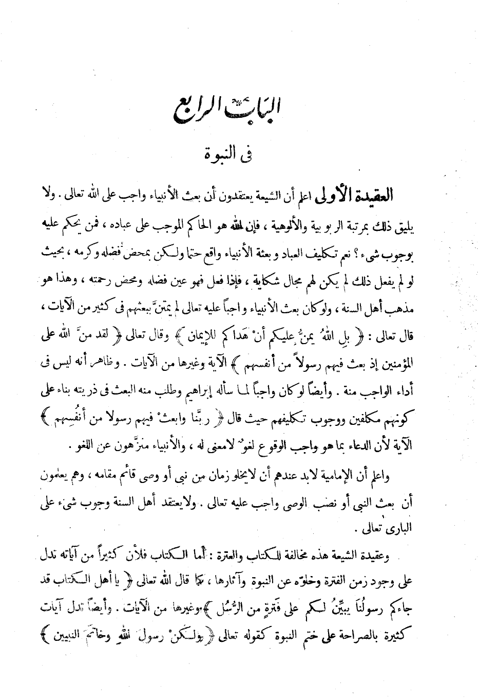 العقيدة الأولى: اعلم أن الشيعة يعتقدون أن بعث الأنبياء واجب على الله تعالى. (¬1) ولا يليق ذلك بمرتبة الربوبية والألوهية، فإن الله هو الحاكم الموجب على عباده، فمن يحكم عليه بوجوب شيء؟ نعم تكليف العباد وبعثة الأنبياء واقع حتما ولكن بمحض فضله وكرمه، بحيث لو لم يفعل ذلك لم يكن لهم مجال شكاية، فإذا فعل فهو عين فضله ومحض رحمته، وهذا هو مذهب أهل السنة. ولو كان بعث الأنبياء واجبا عليه تعالى لم يمتن ببعثهم في كثير من الآيات، قال تعالى: {بل الله يمن عليكم أن هداكم للإيمان} وقال تعالى {لقد من الله على المؤمنين إذ بعث فيهم رسولا من أنفسهم} الآية وغيرها من الأيات. وظاهر أنه ليس في أداء الواجب منه. وأيضا لو كان واجبا لما سأله إبراهيم وطلب منه البعث في ذريته وبناء على كونهم مكلفين ووجوب تكليفهم قال: {ربنا وابعث فيهم رسولا منهم} الآية لأن الدعاء بما هو واجب الوقوع لغو لا معنى له، والأنبياء منزهون عن اللغو.