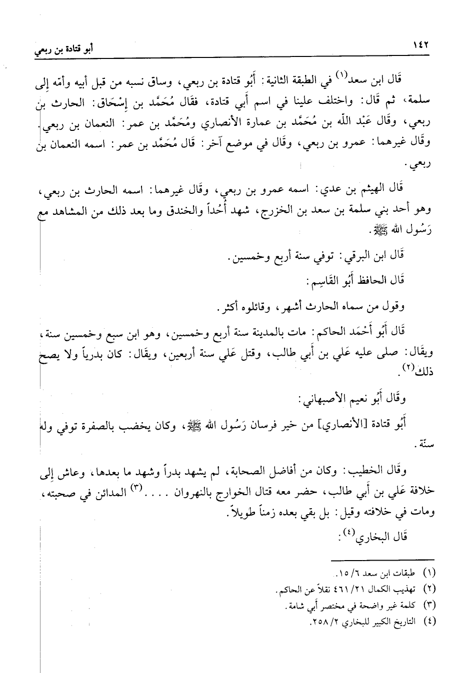قال ابن سعد (1) في الطبقة الثانية أبو قتادة بن ربعي وساق نسبه من قبل أبيه وأمه إلى سلمة ثم قال واختلف علينا في اسم أبي قتادة فقال محمد بن إسحاق الحارث بن ربعي وقال عبد الله بن محمد بن عمارة الأنصاري ومحمد بن عمر النعمان بن ربعي وقال غيرهما عمرو بن ربعي وقال في موضع آخر قال محمد بن عمر اسمه النعمان بن ربعي قال الهيثم بن عدي اسمه عمرو بن ربعي وقال غيرهما اسمه الحارث بن ربعي وهو أحد بني سلمة بن سعد بن الخزرج شهد أحدا والخندق وما بعد ذلك من المشاهد مع رسول الله (صلى الله عليه وسلم) قال ابن البرقي توفي سنة أربع وخمسين قال الحافظ أبو القاسم وقول من سماه الحارث أشهر وقائلوه أكثر قال أبو أحمد الحاكم مات بالمدينة سنة أربع وخمسين وهو ابن سبع وخمسين سنة ويقال صلى الله عليه على بن أبي طالب وقتل علي سنة أربعين ويقال كان بدريا ولا يصح ذلك (2) وقال أبو نعيم الأصبهاني أبو قتادة الأنصاري من خير فرسان رسول الله (صلى الله عليه وسلم) وكان يخضب بالصفرة توفي وله سنة وقال الخطيب وكان من أفاضل الصحابة لم يشهد بدرا وشهد ما بعدها وعاش إلى خلافة علي بن أبي طالب حضر معه قتال الخوارج بالنهروان (3) المدائن في صحبته ومات في خلافته وقيل بل بقي بعده زمنا طويلا قال البخاري (4)