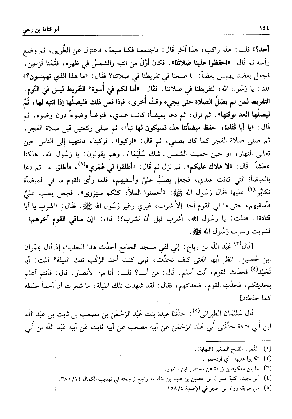 أحد قلت هذا راكب هذا آخر قال فاجتمعنا فكنا سبعة فاعتزل عن الطريق ثم وضع رأسه ثم قال احفظوا علينا صلاتنا فكان أول من انتبه والشمس في ظهره فقمنا فزعين فجعل بعضنا يهمس بعضا ما صنعنا في تفريطنا في صلاتنا فقال ما هذا الذي تهمسون قلنا يا رسول الله تفريطنا في صلاتنا فقال أما لكم في أسوة التفريط ليس في النوم التفريط لمن لم يصل الصلاة حتى يجئ وقت أخرى فإذا فعل ذلك فليصلها إذا انتبه لها ثم لصليها الغد لوقتها ثم نزل ثم دعا بمضيأة كانت عندي فتوضأ وضوءا دون وضوء ثم قال يا أبا قتادة احفظ ميضأتنا هذه فسيكون لها نبأ ثم صلى ركعتين قبل صلاة الفجر ثم صلى صلاة الفجر كما كان يصلى ثم قال اركبوا فركبنا فانتهينا إلى الناس حين تعالى النهار أو حين حميت الشمس شك سليمان وهم يقولون يا رسول الله هلكنا عطشا قال لا هلاك عليكم ثم نزل ثم قال أطلقوا لي غمرى (1) فأطلق له ثم دعا بالمضأة التى كانت عندي فجعل يصب على وأسقيهم فلما رأى القوم ما في الميضأة تكابوا (2) عليها فقال رسول الله (صلى الله عليه وسلم) أحسنوا الملأ كلكم سيروى فجعل يصب على فأسقيهم حتى ما في القوم أحد إلا شرب غيرى وغير رسول الله (صلى الله عليه وسلم) فقال اشرب يا أبا قتادة فقلت يا رسول الله أشرب قبل أن تشرب قال إن ساقي القوم آخرهم فشربت وشرب رسول الله (صلى الله عليه وسلم) قال (3) عبد الله بن رباح إني لفي مسجد الجامع أحدث هذا الحديث إذ قال عمران ابن حصين انظر أيها الفتى كيف تحدث فإني كنت أحد الركب تلك الليلة قلت أبا نجيد (4) فحدث القوم أنت أعلم قال من أنت قلت أنا من الأنصار قال فأنتم أعلم بحديثكم فحدث القوم فحدثتهم فقال لقد شهدت تلك الليلة ما شعرت أن أحدا حفظه كما حفظته قال سليمان الطبراني (5) حدثنا عبدة بنت عبد الرحمن بن مصعب بن ثابت بن عبد الله ابن أبي قتادة حدثني أبي عبد الرحمن عن أبيه مصعب عن ابيه ثابت عن أبيه عبد الله بن أبي