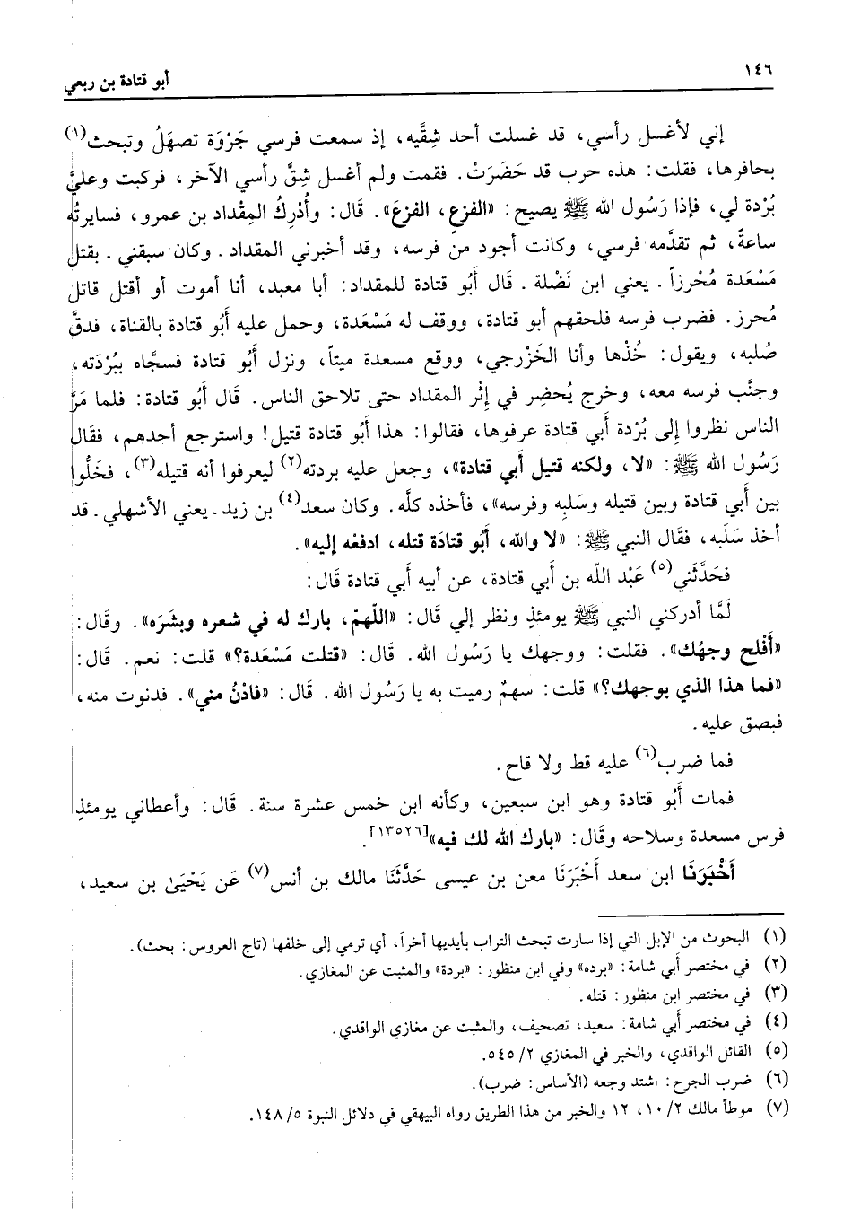 إني لأغسل رأسي قد غسلت أحد شقيه إذ سمعت فرسي جروة تصهل وتبحث (1) بحافرها فقلت هذه حرب قد حضرت فقمت ولم أغسل شق رأسي الآخر فركبت وعلي بردة لي فإذا رسول الله (صلى الله عليه وسلم) يصيح الفزع الفزع قال وأدرك المقداد بن عمرو فسايرته ساعة ثم تقدمه فرسي وكانت أجود من فرسه وقد أخبرني المقداد وكان سبقني بقتل مسعدة محرزا يعني ابن نضلة قال أبو قتادة للمقداد أبا معبد أنا أموت أو أقتل قاتل محرز فضرب فرسه فلحقهم أبو قتادة ووقف له مسعدة وحمل عليه أبو قتادة بالقناة فدق صلبه ويقول خذها وأنا الخزرجي ووقع مسعدة ميتا ونزل أبو قتادة فسجاه ببردته وجنب فرسه معه وخرج يحضر في إثر المقداد حتى تلاحق الناس قال أبو قتادة فلما مر الناس نظروا إلى بردة أبي قتادة عرفوها فقالوا هذا أبو قتادة قتيل واسترجع أحدهم فقال رسول الله (صلى الله عليه وسلم) لا ولكنه قتيل أبي قتادة وجعل عليه بردته (2) ليعرفوا أنه قتيله (3) فخلوا بين أبي قتادة وبين قتيلة وسلبة وفرسه فأخذه كله وكان سعد (4) بن زيد يعني الاشهلى قد أخذ سلبه فقال النبي (صلى الله عليه وسلم) لا والله أبو قتادة قتله ادفعه إليه فحدثني (5) عبد الله بن أبي قتادة عن أبيه أبي قتادة قال لما أدركني النبي (صلى الله عليه وسلم) يومئذ ونظر إلي قال النبي (صلى الله عليه وسلم) يومئذ ونظر إلى قال اللهم بارك له في شعره وبشره وقال أفلح وجهك فقلت ووجهك يا رسول الله قال قتلت مسعدة قلت نعم قال فما هذا الذي وجهك قلت سهم رميت به يا رسول الله قال فادن منى فدنوت منه فبصق عليه فما ضرب (6) عليه قط ولا قاح فمات أبو قتادة وهو ابن سبعين وكأنه ابن خمس عشرة سنة قال وأعطاني يومئذ فرس مسعدة وسلاحة وقال بارك الله لك فيه أخبرنا ابن سعد أخبرنا معن بن عيسى حدثنا مالك بن أنس (7) عن يحيى بن سعيد