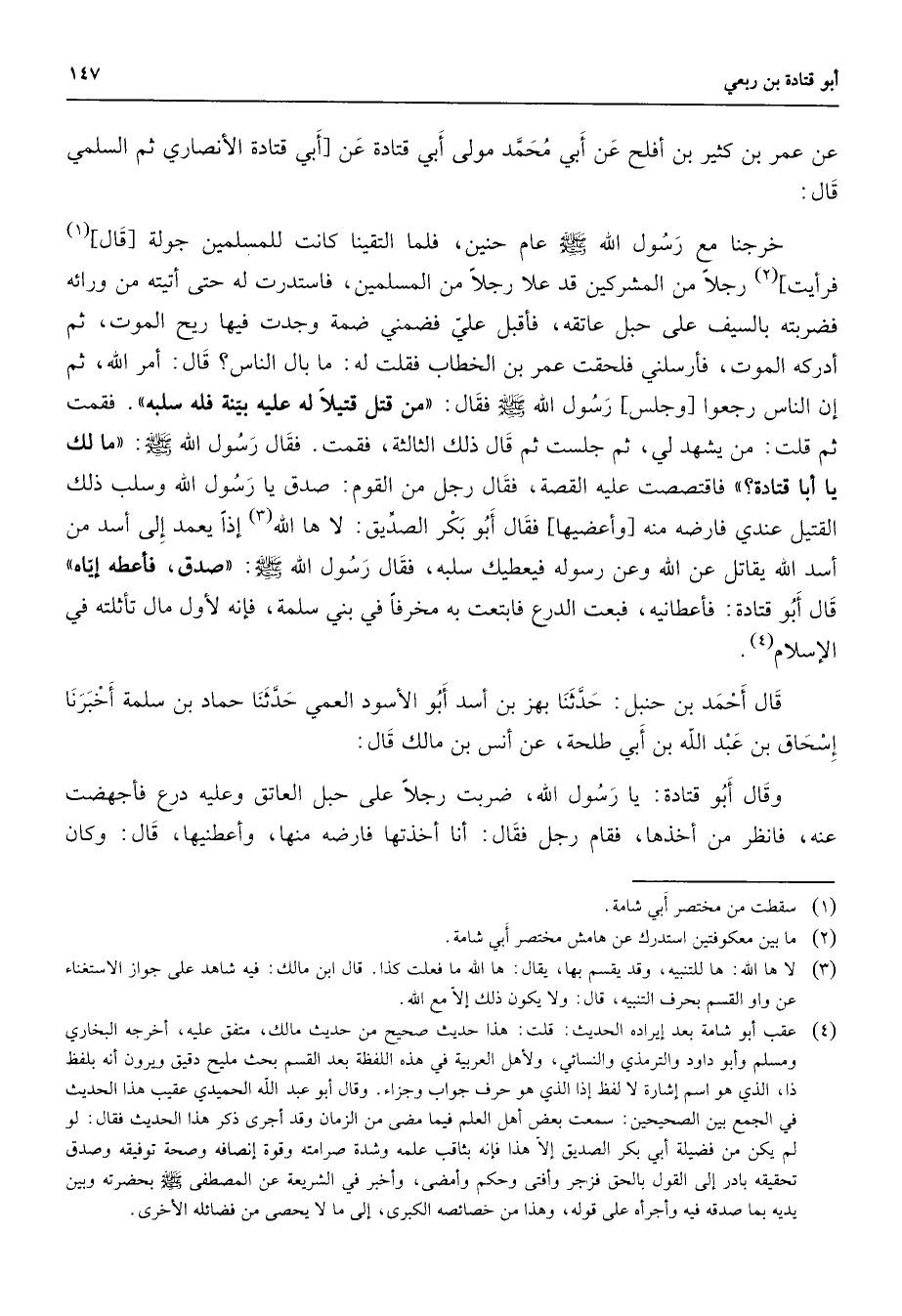 عن عمر بن كثير بن أفلح عن أبي محمد مولى أبي قتادة عن أبي قتادة الأنصاري ثم السلمي قال خرجنا مع رسول الله (صلى الله عليه وسلم) عام حنين فلما التقينا كانت للمسلمين جولة قال (1) فرأيت (2) رجلا من المشركين قد علا رجلا من المسلمين فاستدرت له حتى أتيته من ورائه فضربته بالسيف على حبل عاتقة فأقبل علي فضمني ضمة وجدت فيها ريح الموت ثم أدركه الموت فأرسلني فلحقت عمر بن الخطاب فقلت له ما بال الناس قال امر الله ثم إن الناس رجعوا وجلس رسول الله (صلى الله عليه وسلم) فقال من قتل قتيلا له عليه بينه فله سلبه فقمت ثم قلت من يشهد لي ثم جلست ثم قال ذلك الثالثة فقمت فقال رسول الله (صلى الله عليه وسلم) ما لك يا أبا قتادة فاقتصصت عليه القصة فقال رجل من القوم صدق يا رسول الله وسلب ذلك القتيل عندي فارضة منه وأعضيها فقال أبو بكر صديق لا ها الله (3) إذا يعمد إلى أسد من أسد الله يقاتل عن الله وعن رسوله فيعطيك سلبه فقال رسول الله (صلى الله عليه وسلم) صدق فأعطه إياه قال أبو قتادة فأعطانيه فبعت الدرع فابتعت به مخرفا في بني سلمة فإنه لأول مال تأثلته في الإسلام (4) قال أحمد بن حنبل حدثنا بهز بن أسد أبو الأسود العمي حدثنا حماد بن سلمة أخبرنا إسحاق بن عبد الله بن أبي طلحة عن أنس بن مالك قال وقال أبو قتادة يا رسول الله ضربت رجلا على حبل العاتق وعليه درع فأجهضت عنه فانظر من أخذها فقام رجل فقال أنا أخذتها فارضة منها وأعطنيها قال وكان
