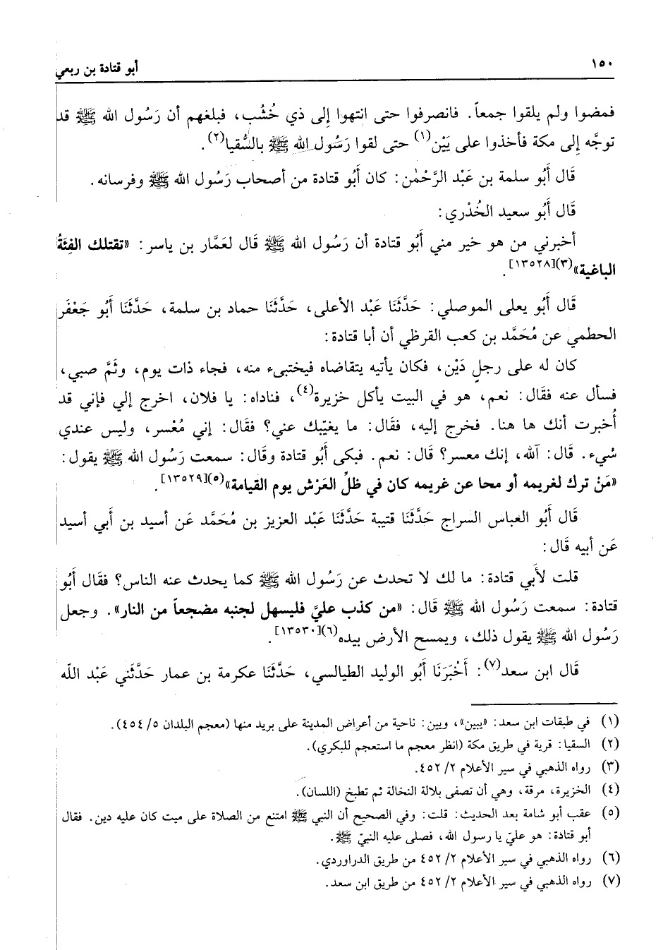 فمضوا ولم يلقوا جمعا فانصرفوا حتى انتهوا إلى ذي خشب فبلغهم أن رسول الله (صلى الله عليه وسلم) قد توجه إلى مكة فأخذوا على يين (1) حتى لقوالا رسول الله (صلى الله عليه وسلم) بالسقيا (2) قال أبو سلمة بن عبد الرحمن كان أبو قتادة من أصحاب رسول الله (صلى الله عليه وسلم) وفرسانه قال أبو سعيد الخدري أخبرني من هو خير منى أبو قتادة أن رسول الله (صلى الله عليه وسلم) قال لعمار بن ياسر تقتلك الفئة الباغية (3) قال أبو يعلى الموصلي حدثنا عبد الأعلى حدثنا حماد بن سلمة حدثنا أبو جعفر الحطمي عن محمد بن كعب القرظي أن أبا قتادة كان له عهلى رجل دين فكان يأتيه يتقاضاه فيختبئ منه فجاء ذات يوم وثم صبي فسأل عنه فقال نعم هو في البيت يأكل خزيرة (4) فناداه يا فلان اخرج إلى فإني قد أخبرت أنك ها هنا فخرج إليه فقال ما يغيبك عنى فقال إني معسر وليس عندي شئ قال الله إنك معسر قال نعم فبكي أبو قتادة وقال سمعت رسول الله (صلى الله عليه وسلم) يقول من ترك لغريمة أو محا عن غريمه كان في ظل العرش يوم القيامة (5) قال أبو العباس السراج حدثنا قتيبة حدثنا عبد العزيز بن محمد عن أسيد بن أبي أسيد عن أبيه قال قلت لأبي قتادة ما لك لا تحدث عن رسول الله (صلى الله عليه وسلم) كما يحدث عنه الناس فقال أبو قتادة سمعت رسول الله (صلى الله عليه وسلم) قال من كذب علي فليسهل لجنبه مضجعا من النار وجعل رسول الله (صلى الله عليه وسلم) يقول ذلك ويمسح الأرض بيده (6) قال ابن سعد (7) أخبرنا أبو الوليد الطيالسي حدثنا عكرمة بن عمار حدثني عبد الله