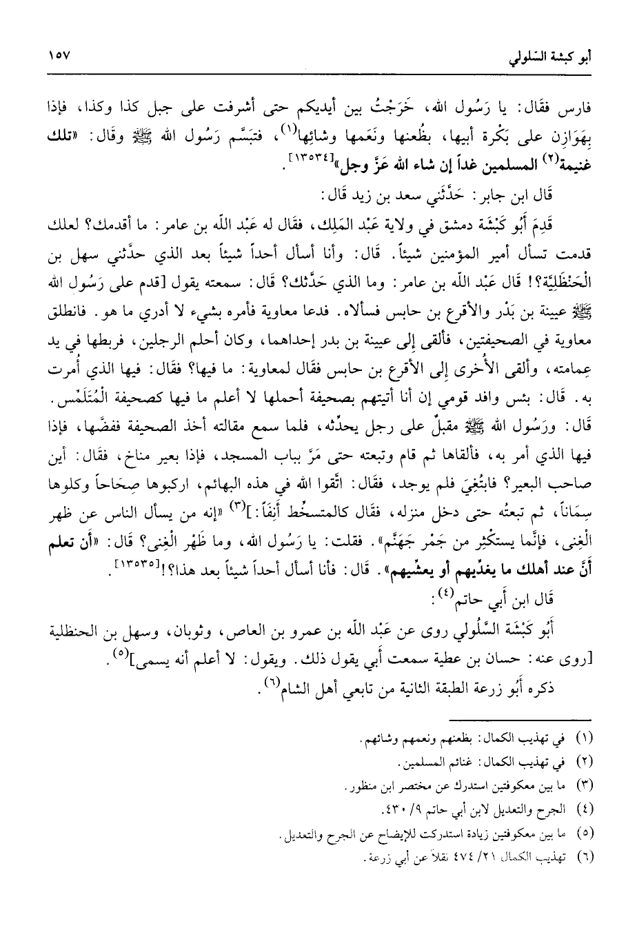 فارس فقال يا رسول الله خرجت بين أيديكم حتى أشرفت على جبل كذا كذا فإذا بهوازن على بكرة أبيها بظعنها ونعمها وشائها (1) فتبسم رسول الله (صلى الله عليه وسلم) وقال تلك غنيمة (2) المسلمين غدا إن شاء الله عز وجل قال ابن جابر حدثني سعد بن زيد قال قدم أبو كبشة دمشق في ولاية عبد الملك فقال له عبد الله بن عامر ما أقدمك لعلك قدمت تسأل أمير المؤمنين شيئا قال وأنا أسأل أحدا شيئالا بعد الذي حدثني سهل بن الحنظلية قال عبد الله بن عامر وما الذي حدثك قال سمعته يقول قدم على رسول الله (صلى الله عليه وسلم) عيينة بن بدر والأقرع بن حابس فسألاه فدعا معاوية فأمره بشئ لا ادرى ما هو فانطلق معاوية في الصحيفتين فألقي إلى عيينة بن بدر إحداهما وكان احلم الرجلين فربطها في يد عمامته وألقي الآخرى إلى الأقرع بن حابس فقال لمعاوية ما فيها فقال فيها الذي أمرت به قال بئس وافد قومي إن أنا أتيتهم بصحيفة أحملها لا اعلم ما فيها كصحيفة المتلمس قال ورسول الله (صلى الله عليه وسلم) مقبل على رجل يحدثه فلما سمع مقالته أخذ الصحيفة ففضها فإذا فيها الذي أمر به فألقاها ثم قام وتبعته حتى مر بباب المسجد فإذا بعير مناخ فقال أين صاحب البعير فابتغي فلم يوجد فقال اتقوا الله في هذه البهائم اركبوها صحاحا وكلوها سمانا ثم تبعته حتى دخل منزله فقال كالمتسخط أنفا (3) إنه من يسأل الناس عن ظهر الغني فإنما يستكثر من جمر جهنم فقلت يا رسول الله وما ظهر الغني قال أن تعلم أن عند أهلك ما يغديهم أو يعشيهم قال فأنا أسأل أحدا شيئا بعد هذا قال ابن أبي حاتم (4) أبو كبشة السلولي روى عن عبد الله بن عمرو بن العاص وثوبان وسهل بن الحنظلية روى عنه حسان بن عطية سمعت أبي ويقول ذلك ويقول لا أعلم أنه يسمى (5) ذكره أبو زرعة الطبقة الثانية من تابعي أهل الشام (6)