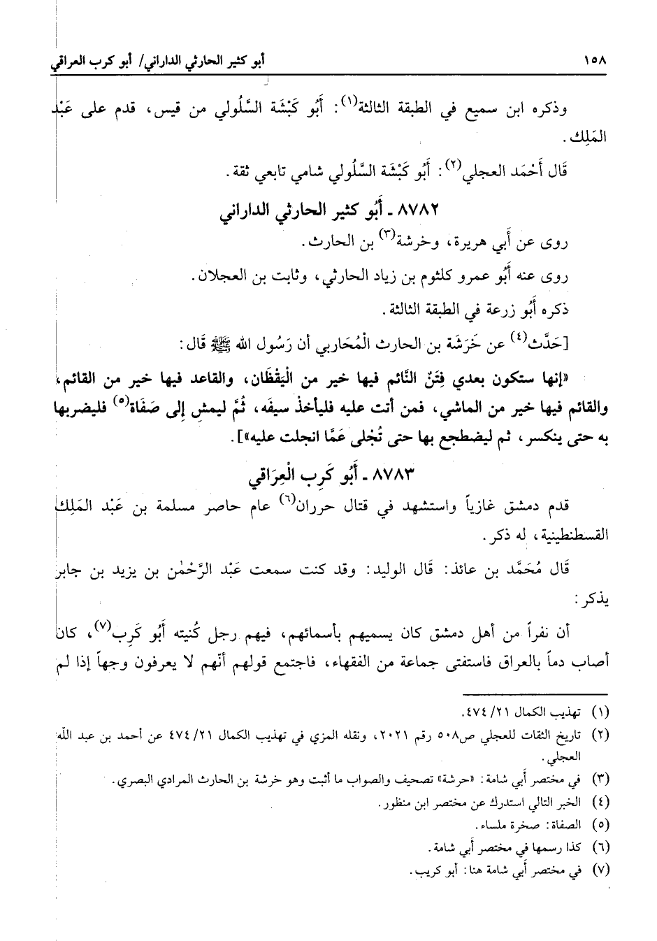 8782 - أبو كثير الحارثي الداراني روى عن أبي هريرة وخرشة (3) بن الحارث روى عنه أبو عمرو كلثوم بن زياد الحارثي وثابت بن العجلان ذكره أبو زرعة في الطبقة الثالثة حدث (4) عن جرشة بن الحارث المحاربي أن رسول الله (صلى الله عليه وسلم) قال إنها ستكون بعدى فتن النائم فيها خير من اليقظان والقاعد فيها خير من القائم والقائم فيها خير من الماشي فمن أتت عليه فليأخذ سيفه ثم ليمش إلى صفاة (5) فليضربها لا به حتى ينكسر ثم ليضطجع بها حتى تجلى عما انجلت عليه