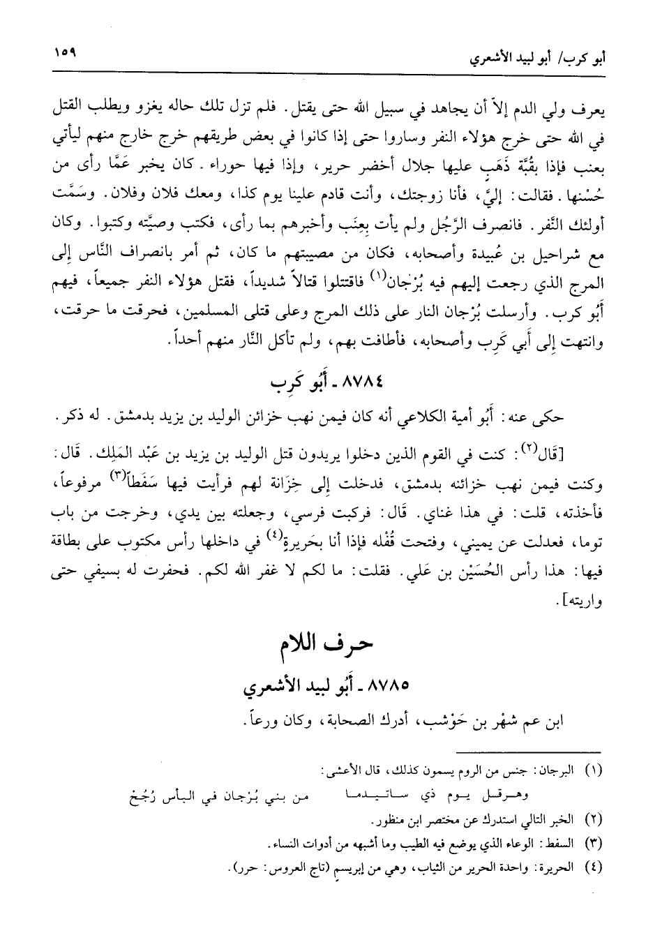 يعرف ولي الدم إلا إن يجاهد في سبيل الله حتى يقتل فلم تزل تلك حاله يغزو ويطلب القتل في الله حتى خرج هؤلاء النفر وساروا حتى إذا كانوا في بعض طريقهم خرج خارج منهم ليأتي بعنب فإذا بقبة ذهب عليها جلال أخضر حرير وإذا فيها حوراء كان يخبر عما رأى من حسنها فقالت إلي فأنا زوجتك وأنت قادم علينا يوم كذا ومعك فلان وفلان وسمت أولئك النفر فانصرف الرجل ولم يأت بعنب وأخبرهم بما رأى فكتب وصيته وكتبوا وكان مع شراحيل بن عبيدة وأصحابه فكان من مصيبتهم ما كان ثم أمر بانصراف الناس الى المرج الذي رجعت إليهم فيه برجان (1) فاقتتلوا قتالا شديدا فقتل هؤلاء النفر جميعا فيهم أبو كرب وأرسلت برجان النار على ذلك المرج وعلى قتلى المسلمين فحرقت ما حرقت وانتهت إلى أبي كرب وأصحابه فأطافت بهم ولم تأكل النار منهم أحدا 8784 أبو كرب حكى عنه أبو أمية الكلاعي أنه كان فيمن نهب خزائن الوليد بن يزيد بدمشق له ذكر قال (2) كنت في القوم الذين دخلوا يريدون قتل الوليد بن يزيد بن عبد الملك قال كنت فيمن نهب خزائنه بدمشق فدخلت إلى خزانة لهم فرأيت فيها سفطا (3) مرفوعا فأخذته قلت في هذا غناى قال فركبت فرسي وجعلته بين يدي وخرجت من باب توما فعدلت عن يميني وفتحت قفلة فإذا أنا بحريرة (4) في داخلها رأس مكتوب على بطاقة فيها هذا رأس الحسين بن علي فقلت ما لكم لا غفر الله لكم فحفرت له بسيفي حتى واريته " حرف اللام "
