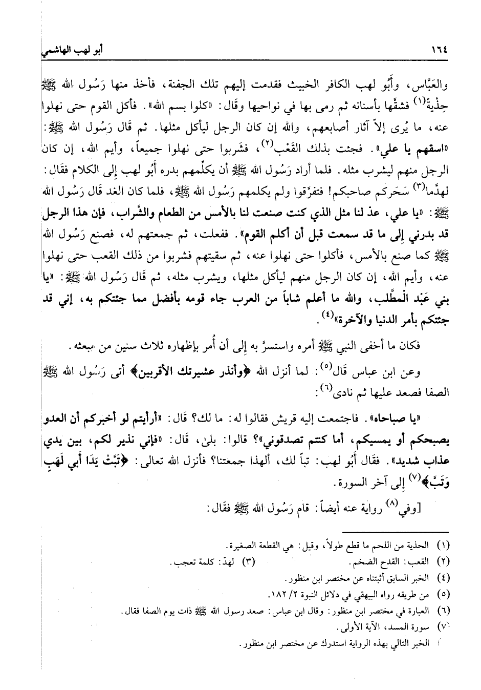 والعباس وأبو لهب الكافر الخبيث فقدمت إليهم تلك الجفنة فأخذ منها رسول الله (صلى الله عليه وسلم) حذبية (1) فشقها بأسنانه ثم رمى بها في نواحيها وقال كلوا بسم الله فأكل القوم حتى نهلوا عنه ما يرى إلا آثار أصابعهم والله أن كان الرجل ليأكل مثلها ثم قال رسول الله (صلى الله عليه وسلم) اسقهم يا علي فجئت بذلك القعب (2) فشربوا حتى نهلوا جميعا وأيم الله إن كان الرجل منهم ليشرب مثله فلما أراد الرسول (صلى الله عليه وسلم) أن يكلمهم بدره أبو لهب إلى الكلام فقال لهدما (3) سحركم صاحبكم فتفرقوا ولم يكلمهم رسول الله (صلى الله عليه وسلم) فلما كان الغد قال رسول الله (صلى الله عليه وسلم) يا علي عد لنا مثل الذي كنت صنعت لنا بالأمس من الطعام والشراب فإن هذا الرجل قد بدرني إلى ما قد سمعت قبل أن أكلم القوم ففعلت ثم جمعتهم له فصنع رسول الله (صلى الله عليه وسلم) كما صنع بالأمس فأكلوا حتى نهلوا عنه ثم سقيتهم فشربوا من ذلك القعب حتى نهلوا عنه وأيم الله إن كان الرجل منهم ليأكل مثلها ويشرب مثله ثم قال رسول الله (صلى الله عليه وسلم) يا بني عبد المطلب والله ما أعلم شابا من العرب جاء قومه بأفضل مما جئتكم به إني قد جئتكم بأمر الدنيا والآخرة (4) فكان ما أخفي النبي (صلى الله عليه وسلم) أمره واستسر به إلى أن أمر بإظهاره ثلاث سنين من مبعثه وعن ابن عباس قال (5) لما أنزل الله " وأنذر عشيرتك الأقربين " أتى رسول الله (صلى الله عليه وسلم) الصفا فصعد عليها ثم نادى (6) يا صباحاه فاجتمعت إليه قريش فقالوا له ما لك قال أرأيتم لو أخبركم أن العدو يصبحكم أو يمسيكم أما كنتم تصدقوني قالوا بلى قال فإني نذير لكم بين يدي عذاب شديد فقال أبو لهب تبا لك ألهذا جمعتنا فأنزل الله تعالى " تبت يدا أبي لهب وتب " (7) إلي آخر السورة وفي (8) رواية عنه أيضا قام رسول الله (صلى الله عليه وسلم) فقال