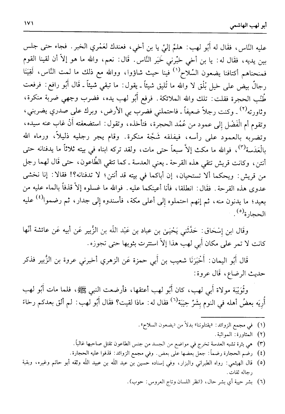 عليه الناس فقال له أبو لهب هلم إلي يا ابن أخي فعندك لعمري الخبر فجاء حتى جلس بين يديه فقال له يا بن أخي خبرني خبر الناس قال نعم والله ما هو إلا أن لقينا القوم فمنحناهم أكتافنا يضعون السلاح (1) فينا حيث شاوؤا ووالله مع ذلك ما لمت الناس لقينا رجال بيض على خيل بلق لا والله ما تليق شيئا يقول ما تبقي شيئا قال أبو رافع فرفعت طنب الحجرة فقلت تلك والله الملائكة فرفع أبو لهب يده فضرب وجهي ضربة منكرة وثاورته (2) وكنت رجلا ضعيفا فاحتملني فضرب بي الأرض وبرك على صدري يضربني وتقوم أم الفضل إلى عمود من عمد الحجرة فتأخذه وتقول استضعته أن غاب عنه سيده وتضربه بالعمود على رأسه فيفلقه شجة منكرة وقام يجر رجليه ذليلا ورماه الله بالعدسة (3) فوالله ما مكث إلا سبعا حتى مات ولقد تركه ابناه في بيته ثلاثا ما كيد فنائه حتى أنتن وكانت قريش تتقي هذه القرحة يعني العدسة كما تتقي الطاعون حتى قال لهما رجل من قريش ويحكما ألا تستحيان إن أباكما في بيته قد أنتن لا تدفنانه فقالا إنا نخشي عدوى هذه القرحة فقال انطلقا فأنا أعينكما عليه فوالله ما غسلوه إلا قذفا بالماء عليه من بعيد ما يدنون منه ثم إنهم احتملوه إلى أعلى مكة فأسندوه إلى جدار ثم رضموا (4) عليه الحجارة (5) وقال ابن إسحاق حدثني يحيى بن عباد بن عبد الله بن الزبير عن أبيه عن عائشة أنها كانت لا تمر على مكان أبي لهب هذا إلا استترت بثوبها حتى تجوزه قال أبو اليمان أخبرنا شعيب بن أبي حمزة عن الزهري أخبرني عروة بن الزبير فذكر حديث الرضاع قال عروة وثويبة مولاة أبي لهب كان كان أبو لهب أعتقها فأرضعت النبي (صلى الله عليه وسلم) فلما مات أبو لهب أريه بعض أهله في النوم بشر حيبة (6) فقال له ماذا لقيت فقال أبو لهب لم ألق بعدكم رخاء