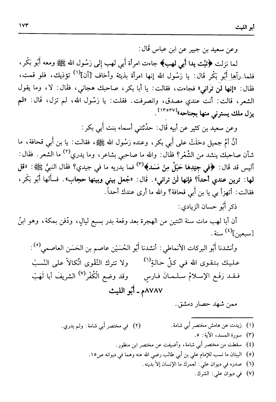 وعن سعيد بن جبير عن ابن عباس قال لما نزلت " تبت يدا أبي لهب " جاءت أمرأة أبي لهب إلى رسول الله (صلى الله عليه وسلم) ومعه أبو بكر فلما رآها أبو بكر قال يا رسول الله إنها امرأة بذيئة وأخاف أن (1) تؤذيك فلو قمت فقال إنها لن تراني فجاءت فقالت يا أبا بكر صاحبك هجاني فقال لا وما يقول الشعر قالت أنت عندي مصدق وانصرفت فقلت يا رسول الله لم تزل قال لم يزل ملك يسترني منها بجناحه وعن سعيد بن كثير عن أبيه قال حدثتني أسماء بنت أبي بكر أن أم جميل دخلت على أبي بكر وعنده رسول الله (صلى الله عليه وسلم) فقالت يا بن أبي قحافة ما شأن صاحبك ينشد من الشعر فقال والله ما صاحبي بشاعر وما يدري (2) ما الشعر فقال أليس قد قال " في جيدها حبل من مسد " (3) فما يدريه ما في جيدي فقال النبي (صلى الله عليه وسلم) قل لها ترين عندي أحدا فإنها لن تراني قال جعل بيني وبينها حجاب فسألها أبو بكر فقالت أتهزأ بي يا بن أبي قحافة والله ما أرى عندك أحدا ذكر أبو حسان الزيادي أن أبا لهب مات سنة اثنتين من الهجرة بعد وقعه بدر بسبع ليال ودفن بمكة وهو ابن سبعين (4) سنة وأنشدنا أبو البركات الأنماطي أنشدنا أبو الحسين عاصم بن الحسن العاصمي (5) * عليك بتقوى الله في كل حالة * (6) ولا تترك التقوي اتكالا على النسب فقد رفع الإسلام سلمان فارس * وقد وضع الكفر (7) الشريف أبا لهب