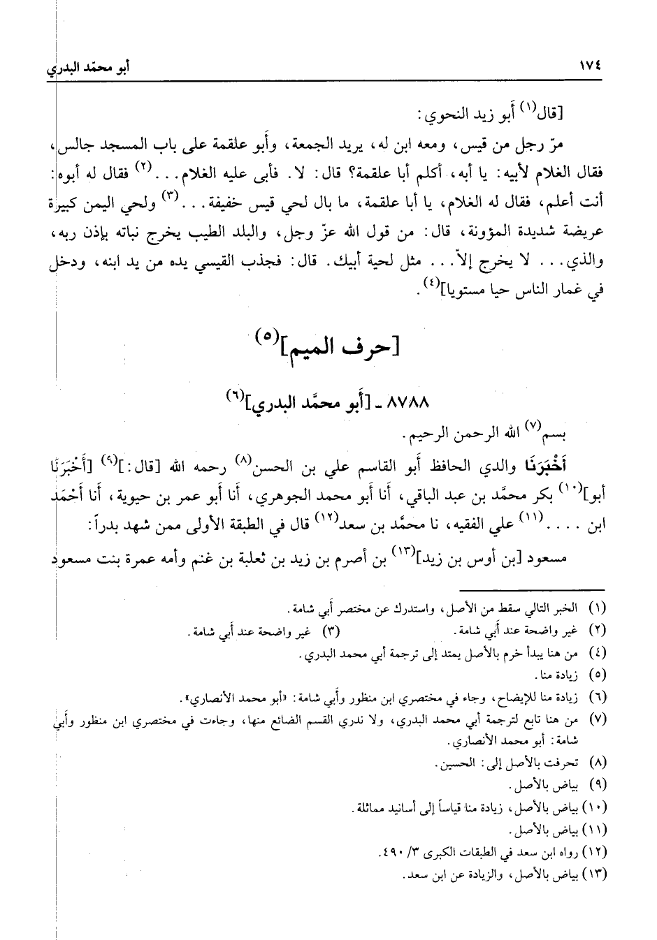 8788 - أبو محمد البدرى (6) بسم (7) الله الرحمن الرحيم أخبرنا والدى الحافظ أبو القاسم علي بن الحسن (8) رحمه الله قال (9) أخبرنا أبو (10) بكر محمد بن عبد الباقي أنا أبو محمود الجوهرى أنا أبو عمر بن حيوية أنا أحمد ابن (11) على الفقيه نا محمد بن سعد (12) قال في الطبقة الأولى ممن شهد بدرا مسعود بن أوس بن زيد (13) بن أصرم بن زيد بن ثعلبة بن غنم وأمه عمرة بنت مسعود