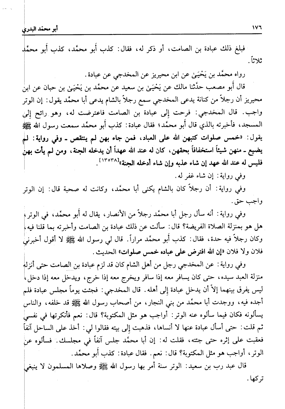 وكان رجلا فيه حدة فقال كذب أبو محمد مرارا قال لي رسول الله (صلى الله عليه وسلم) لا أقول أخبرني فلان ولا فلان إن الله افترض على عباده خمس صلوات الحديث وفي رواية عن المخدجي رجل من أهل الشام كان قد لزم عبادة بن الصامت حتى انزله منزلة العبد سيده حتى كان يسافر معه إذا سافر ويخرج معه إذا خرج ويدخل معه إذا دخل ليس يفرق بينهما إلا أن يدخل عبادة إلى أهله قال المخدجي فجئت يوما مجلس عبادة فلم أجده فيه ووجدت أبا محمد من بني النجار من أصحاب رسول الله (صلى الله عليه وسلم) قد خلفه والناس يسألونه فكان فيما سألوه عنه الوتر أواجب هو مثل المكتوبة قال نعم فأنكرتها في نفسي ثم قلت حتى أسأل عبادة عنها لا انساها فذهبت إلى بيته فقالوا لي أخذ على الساحل آنفا فعقبت على أثره حتى جئته فقلت له إن أبا محمد جلس آنفا في مجلسك فسألوه عن الوتر أواجب هو مثل المكتوبة قال نعم فقال عبادة كذب أبو محمد قال عبد رب بن سعيد الوتر سنة أمر بها رسول الله (صلى الله عليه وسلم) وصلاها المسلمون لا ينبغي تركها