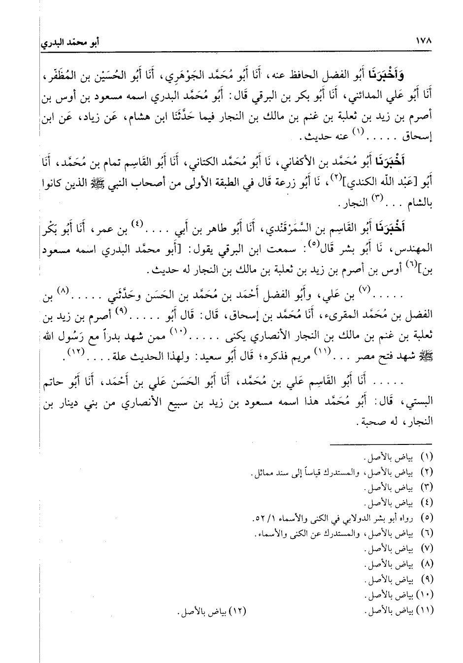 وأخبرنا أبو الفضل الحافظ عنه أنا أبو محمد الجوهرى أنا أبو الحسين بن المظفر أنا أبو علي المدائني أنا أبو بكر بن البرقي قال أبو محمد البدري اسمه مسعود بن أوس بن أصرم بن زيد بن ثعلبة بن غنم بن مالك بن النجار فيما حدثنا ابن هشام عن زياد عن ابن إسحاق (1) عنه حديث أخبرنا أبو محمد بن الأكفاني نا أبو محمد الكتاني أنا أبو القاسم تمام بن محمد أنا أبو عبد الله الكندي (2) نا أبو زرعة قال في الطبقة الأولى من أصحاب النبي (صلى الله عليه وسلم) الذين كانوا بالشام (3) النجار أخبرنا أبو القاسم بن السمرقندي أنا أبو طاهر بن أبي (4) بن عمر أنا أبو بكر المهندس نا أبو بشر قال (5) سمعت ابن البرقي يقول أبو محمد البدري اسمه مسعود بن (6) أوس بن أصرم بن زيد بن ثعلبة بن مالك بن النجار له حديث (7) بن علي وأبو الفضل أحمد بن محمد بن الحسن وحدثني (8) بن الفضل بن محمد المقرئ أنا محمد بن إسحاق قال قال أبو (9) أصرم بن زيد بن ثعلبة بن غنم بن مالك بن النجار الأنصاري يكني (10) ممن شهد بدرا مع رسول الله (صلى الله عليه وسلم) شهد فتح مصر (11) مريم فذكره قال أبو سعيد ولهذا الحديث علة (12) أنا أبو القاسم علي بن محمد أنا أبو الحسن علي بن أحمد أنا أبو حاتم البستى قال أبو محمد هذا اسمه مسعود بن زيد بن سبيع الأنصاري من بني دينار بن النجار له صحبة