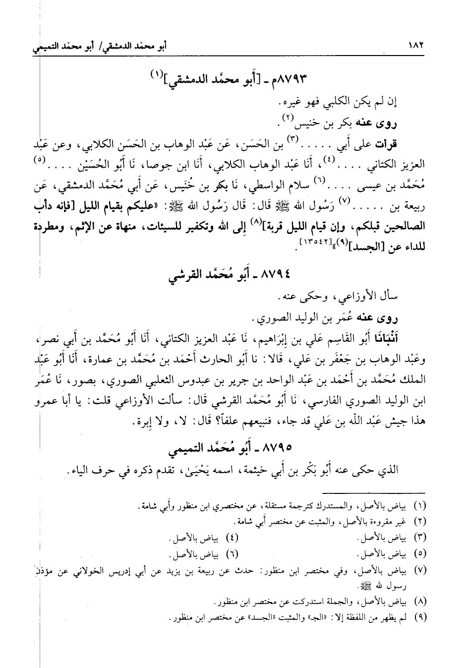 8793 - م - أبو محمد الدمشقي (1) إن لم يكن الكلبي فهو غيره روى عنه بكر بن خنيس (2) قرأت على أبي (3) بن الحسن عن عبد الهاب بن الحسن الكلابي وعن عبد العزيز الكتاني (4) أنا عبد الوهاب الكلابي أنا ابن جوصا نا أبو الحسين (5) محمد بن عيسى (6) سلام الواسطي نا بكر بن خنيس عن أبي محمد الدمشقي عن ربيعة بن (7) رسول الله (صلى الله عليه وسلم) قال قال رسول الله (صلى الله عليه وسلم) عليكم بقيام الليل فإنه دأب الصالحين قبلكم وإن قيام الليل قربة (8) إلى الله وتكفير للسيئات منهاة عن الإثم ومطردة للداء عن الجسد (9)