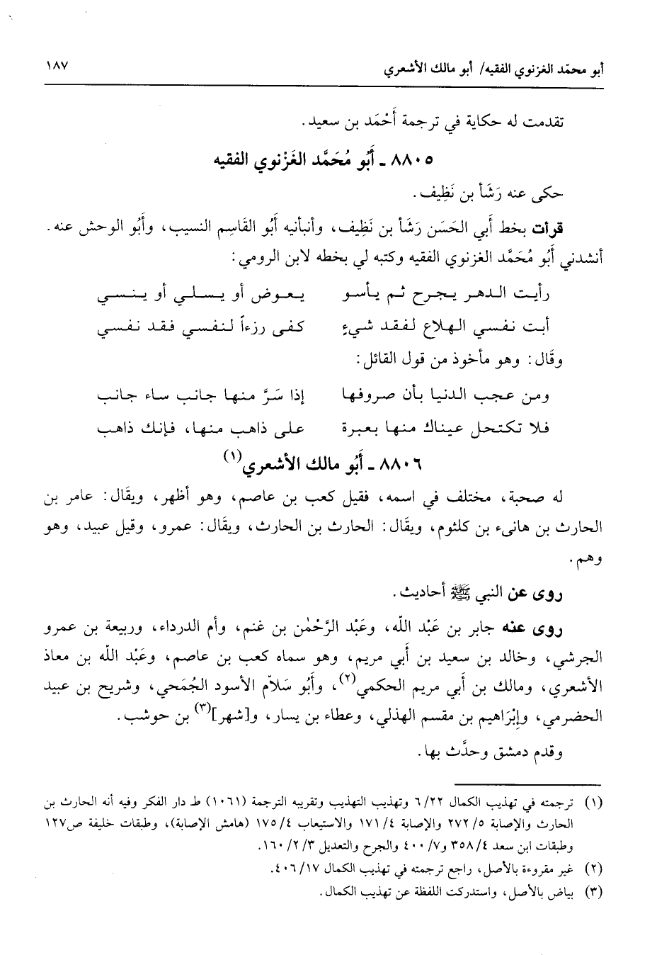 8805 - أبو محمد الغزنوى الفقيه حكى عنه رشأ بن نظيف قرأت بخط أبي الحسن رشأ بن نظيف وأنبأنية أبو القاسم النسيب وأبو الوحش عنه أنشدني أبو محمد الغزنوي الفقيه وكتبه لي بخطه لابن الرومي * رأيت الدهر يجرح ثم يأسو * يعوض أو يسلى أو ينسي أبت نفسي الهلاع لفقد شئ * كفى رزءا لنفسي فقد نفسي * وقال وهو مأخوذ من قول القائل * ومن عجب الدنيا بأن صروفها * إذا سر منها جانب ساء جانب فلا تكتحل عيناك منها بعبرة * على ذاهب منها فإنك ذاهب *