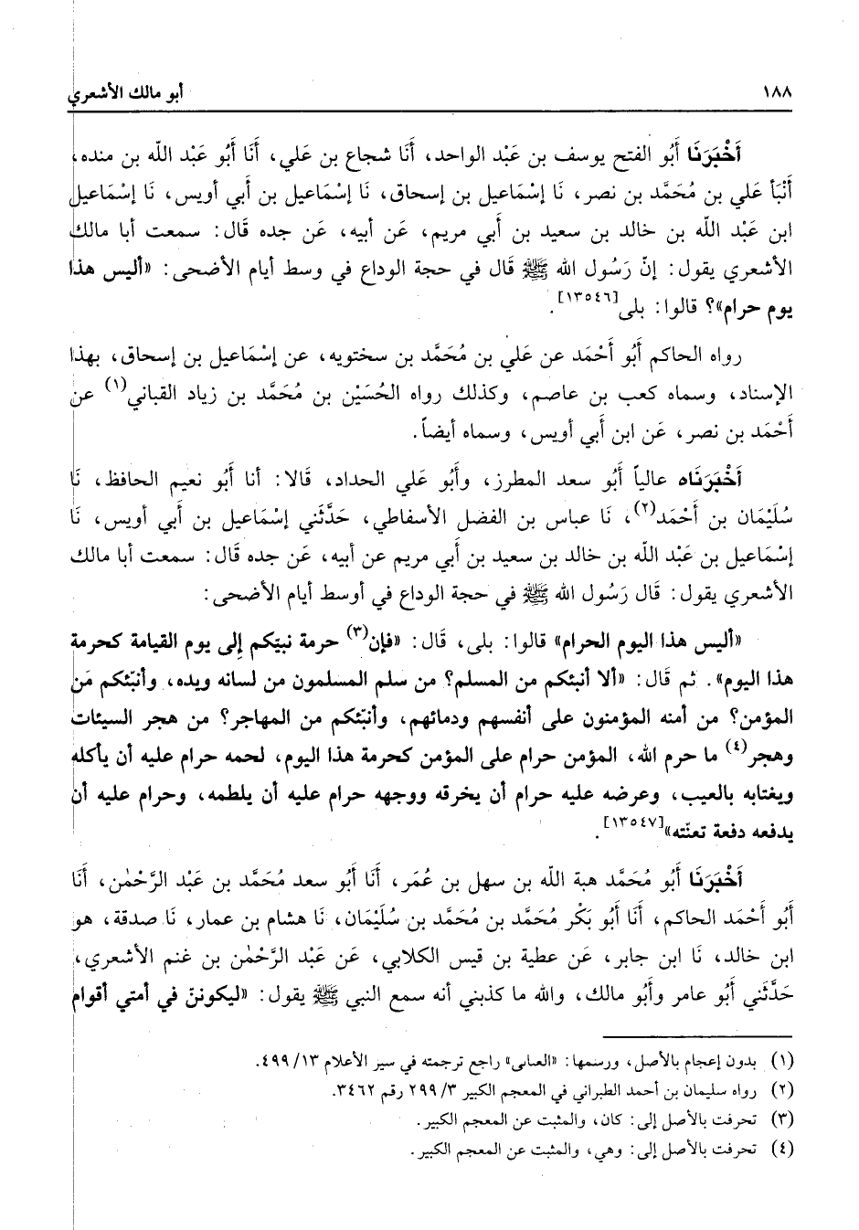 أخبرنا أبو الفتح يوسف بن عبد الواحد أنا شجاع بن علي أنا أبو عبد الله بن منده أنبأ علي بن محمد بن نصر نا إسماعيل بن إسحاق نا إسماعيل بن أبي أويس نا إسماعيل ابن عبد الله بن خالد بن سعيد بن أبي مريم عن أبيه عن جده قال سمعت أبا مالك الأشعري يقول إن رسول الله (صلى الله عليه وسلم) قال في حجة الوداع في وسط أيام الأضحي أليس هذا يوم حرام قالوا بلى رواه الحاكم أبو أحمد عن علي بن محمد بن سختويه عن إسماعيل بن إسحاق بهذا الإسناد وسماه كعب بن عاصم وكذلك رواه الحسين بن محمد بن زياد القباني (1) عن أحمد بن نصر عن ابن أبي أويس وسماه أيضا أخبرناه عاليا أبو سعد المطرز وأبو علي الحداد قالا أنا أبو نعيم الحافظ نا سليمان بن أحمد (2) نا عباس بن الفضل الأسفاطي حدثني إسماعيل بن أبي أويس نا إسماعيل بن عبد الله بن خالد بن سعيد بن أبي مريم عن أبيه عن جده قال سمعت أبا مالك الأشعري يقول قال رسول الله (صلى الله عليه وسلم) في حجة الوداع في أوسط أيام الأضحي أليس هذا اليوم الحرام قالوا بلى قال فإن (3) حرمة نبيكم إلى يوم القيامة كحرمة هذا اليوم ثم قال ألا أنبئكم من المسلم من سلم المسلمون من لسانه ويده وأنبئكم من المؤمن من أمنه المؤمنون على أنفسهم ودمائهم وأنبئكم من المهاجر من هجر السيئات وهجر (4) ما حرم الله المؤمن حرام على المؤمن كحرمة هذا اليوم لحمه حرام عليه أن يأكله وبغتابه بالعيب وعرضه عليه حرام أن يخرقة ووجهه حرام عليه أن يلطمه وحرام عليه أن دفعه دفة تعنته أخبرنا أبو محمد هبة الله بن سهل بن عمر أنا أبو سعد محمد بن عبد الرحمن أنا أبو أحمد الحاكم أنا أبو بكر محمد بن محمد بن سليمان نا هشام بن عمار نا صدقة هو ابن خالد نا ابن جابر عن عطية بن قيس الكلابي عن عبد الرحمن بن غنم الأ شعري حدثني أبو عامر وأبو مالك والله ما كذبني أنه سمع النبي (صلى الله عليه وسلم) يقول ليكونن في أمتى أقوام