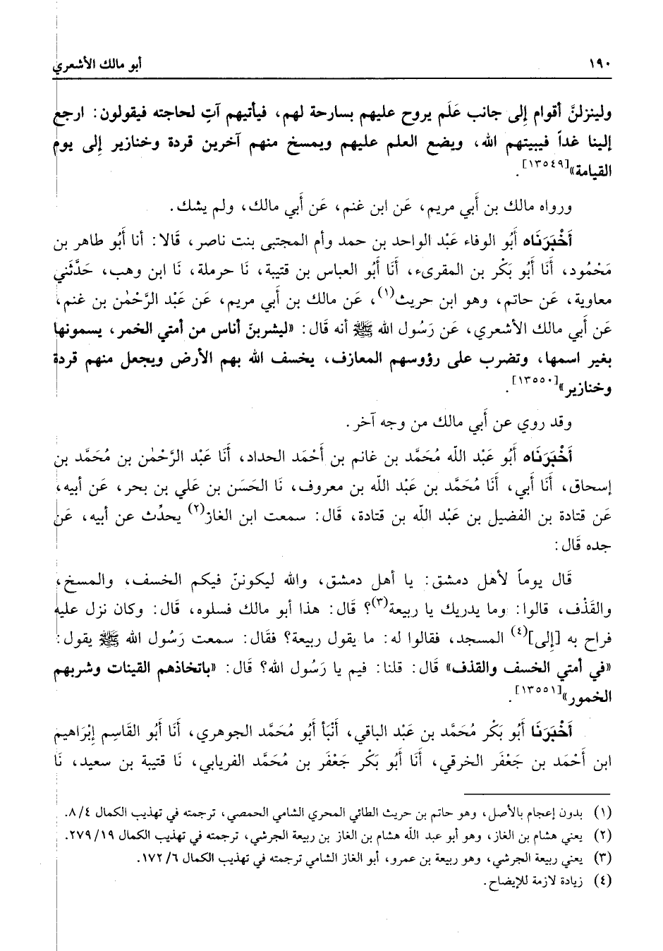 ولينزلن إلي جانب علم يروح عليهم بسارحة لهم فيأتيهم آت لحاجته فيقولون ارجع إلينا غدا فيبيتهم الله ويضع العلم عليهم ولمسخ منهم آخرين قردة وخنازير إلي يوم القيامة ورواه مالك بن أبي مريم عن ابن غنم عن ابي مالك ولم يشك أخبرناه أبو الوفاء عبد الواحد بن حمد وأم المجتبي بنت ناصر قالا أنا أبو طاهر بن محمود معاوية أنا أبو بكر بن المقرئ أنا أبو العباس بن قتيبة نا حرملة نا ابن وهب حدثني معاوية عن حاتم وهو ابن حريث (1) عن مالك بن أبي مريم عن عبد الرحمن بن غنم عن أبي مالك الأشعري عن رسول الله (صلى الله عليه وسلم) أنه قال ليشربن أناس من أمتى الخمر يسمونها بغير اسمها وتضرب على رؤوسهم المعازف يخسف الله بهم الأرض ويجعل منهم قردة وخنازير وقد روى عن أبي مالك من وجه آخر أخبرناه أبو عبد الله محمد بن غانم بن أحمد الحداد أنا عبد الرحمن بن محمد بن إسحاق أنا أبي أنا محمد بن عبد الله بن معروف نا الحسن بن علي بن بحر عن أبيه عن قتادة بن الفضيل بن عبد الله بن قتادة قال سمعت ابن الغار (2) يحدث عن أبيه عن جده قال قال يوما لأهل دمشق يا أهل دمشق والله ليكونن فيكم الخسف والمسخ والقذف قالوا وما يدريك يا ربيعة (3) قال هذا أبو مالك فسلوه قال وكان نزل عليه فراح به إلى (4) المسجد فقالوا له ما يقول ربيعة فقال سمعت رسول الله (صلى الله عليه وسلم) يقول في أمتى الخسف والقذف قال قلنا فيم يا رسول الله قال باتخاذهم القينات وشربهم الخمور أخبرنا أبو بكر محمد بن عبد الباقي أنبأ أبو محمد الجوهرى أنا أبو القاسم إبراهيم ابن أحمد بن جعفر الخرقي انا أبو بكر جعفر بن محمد الفريابي نا قتيبة بن سعيد نا