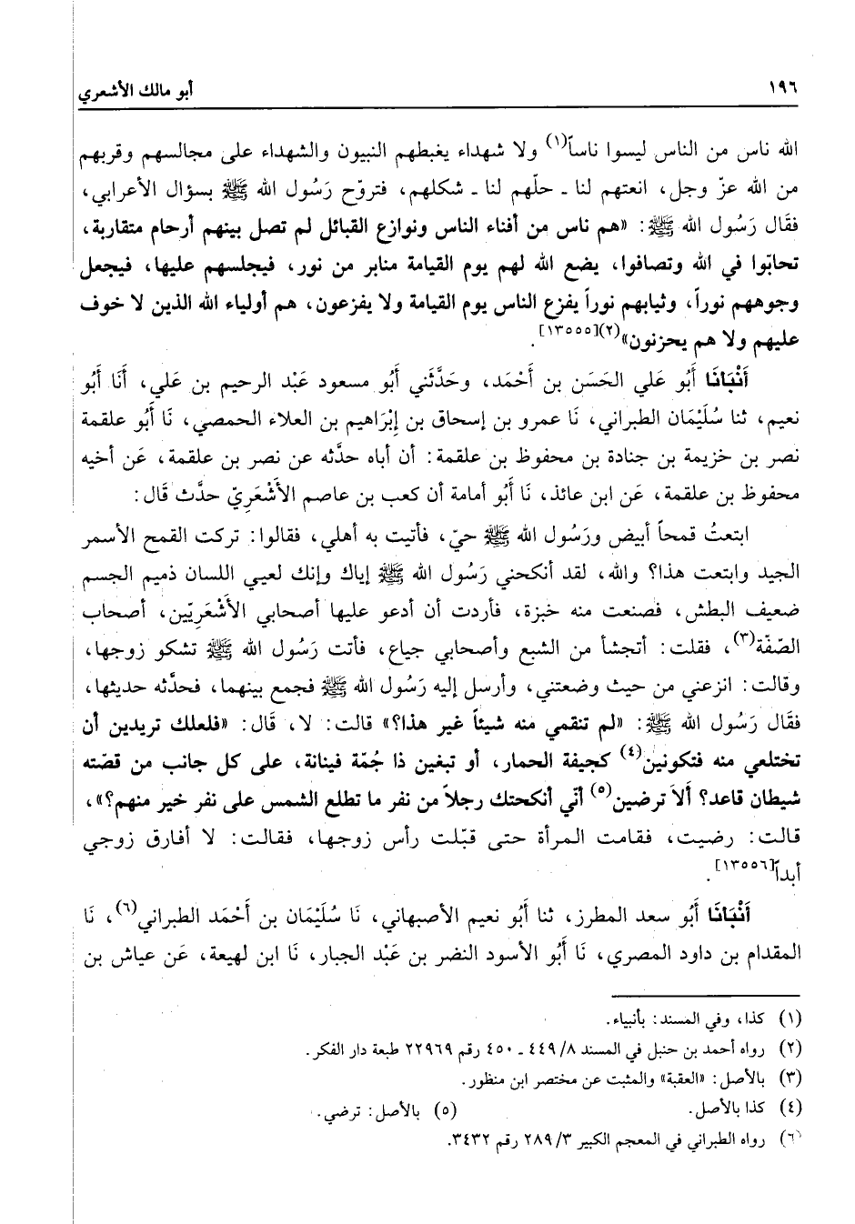 الله ناس من الناس ليسوا ناسا (1) ولا شهداء يغبطهم النبيون والشهداء على مجالسهم وقربهم من الله عز وجل انعتهم لنا حلهم لنا شكلهم فتروح رسول الله (صلى الله عليه وسلم) بسؤال الأعرابي فقال رسول الله (صلى الله عليه وسلم) هم ناس من أفناء الناس ونوازع القبائل لم تصل بينهم أرحام متقاربة تحابوا في الله وتصافوا يضع الله لهم يوم القيامة منابر من نور فيجلسهم عليها فيجعل وجوههم نورا وثيابهم نورا يفزع الناس يوم القيامة ولا يفزعون هم أولياء الله الذين لا خوف عليهم ولاهم يحزنون (2) أنبأنا أبو علي الحسن بن أحمد وحدثني أبو مسعود عبد الرحيم بن علي أنا أبو نعيم ثنا سليمان الطبراني نا عمرو بن إسحاق بن إبراهيم بن العلاء الحمصي نا أبو علقمة نصر بن خزيمة بن جنادة بن محفوظ بن علقمة أن أباه حدثه عن نصر بن علقمة عن أخيه محفوظ بن علقمة عن ابن عائذ نا أبو أمامة أن كعب بن عاصم الأشعري حدث قال ابتعت قمحا أبيض ورسول الله (صلى الله عليه وسلم) حي فأتيت به اهلي فقالوا تركت القمح الأسمر الجيد وابتعت هذا والله لقد أنكحني رسول الله (صلى الله عليه وسلم) إياك وإنك لعيي اللسان ذميم الجسم ضعيف البطش فصنعت منه خبزة فأردت أن أدعو عليها أصحابي الأشعريين أصحاب الصفة (3) فقلت أتجشا من الشبع وأصحابي جياع فأتت رسول الله (صلى الله عليه وسلم) تشكو زوجها وقالت انزعني من حيث وضعتني وأرسل إليه رسول الله (صلى الله عليه وسلم) فجمع بينهما فحدثه حديثها فقال رسول الله (صلى الله عليه وسلم) لم تنقمي منه شيئا غير هذا قالت لا قال فلعلك تريدين أن تختلعي منه فتكونين (4) كجيفة الحمار أو تبغين ذا جمة فينانة على كل جانب من قصته شيطان قاعد ألا ترضين (5) أني أنكحتك رجلا من نفر ما تطلع الشمس على نفر خير منهم قالت رضيت فقامت المرأة حتى قبلت رأس زوجها فقالت لا أفارق زوجي أبدا أنبأنا أبو سعد المطرز ثنا أبو نعيم الأصبهاني نا سليمان بن أحمد الطبراني (6) نا المقدام بن داود المصري نا أبو الأسود النضر بن عبد الجبار نا ابن لهيعة عن عياش بن