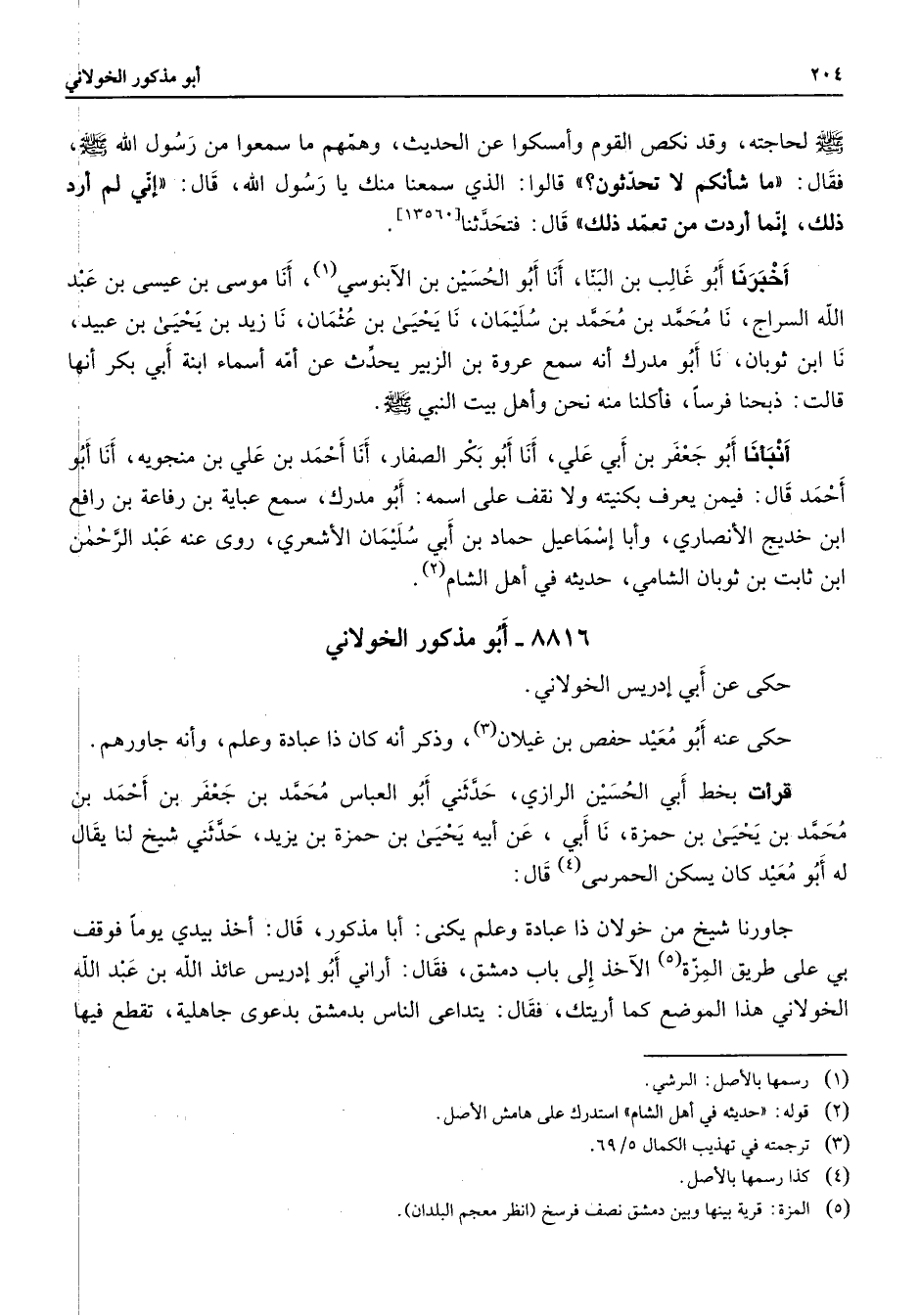 8816 - أبو مذكور الخولاني حكى عن أبي إدريس الخولاني حكى عنه أبو معيد حفص بن غيلان (3) وذكر أنه كان ذا عبادة وعلم وأنه جاورهم قرأت بخط أبي الحسين الرازي حدثني أبو العباس محمد بن جعفر بن احمد بن محمد بن يحيى بن حمزة نا أبي عن أبيه يحيى بن حمزة بن يزيد حدثني شيخ لنا يقال له أبو معيد كان يسكن الحمرى (4) قال جاورنا شيخ من خولان ذا عبادة وعلم يكنى أبا مذكور قال أخذ بيدي يوما فوقف بي على طريق المزة (5) الآخذ إلى باب دمشق فقال أراني أبو أدريس عائذ الله بن عبد الله الخولاني هذا الموضع كما أريتك فقال يتداعى الناس بدمشق بدعوى جاهلية تقطع فيها