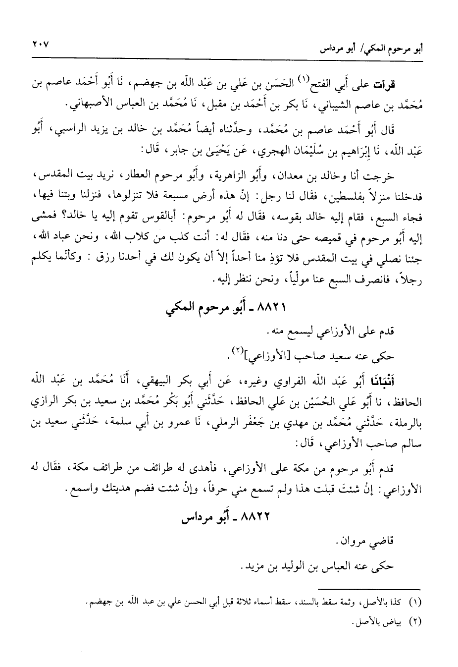 8821 - أبو مرحرم المكي قدم على الأوزاعي ليسمع منه حكى عنه سعيد صاحب الأوزاعي (2) أنبأنا أبو عبد الله الفراوي وغيره عن أبي بكر البيهقي أنا محمد بن عبد الله الحافظ نا أبو علي الحسين بن علي الحافظ حدثني أبو بكر محمد بن سعيد بن بكر الرازي بالرملة حدثني محمد بن مهدي بن جعفر الرملي نا عمرو بن أبي سلمة حدثني سعيد بن سالم صاحب الأوزاعي قال قدم أبو مرحوم من مكة على الأوزاعي فأهدى له طرائف من طرائف مكة فقال له الأوزاعي إن شئت قبلت هذا ولم تسمع مني حرفا وإن شئت فضم هديتك واسمع